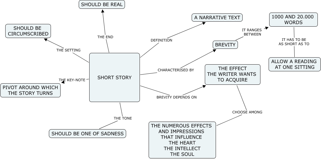 Questa Mappa Concettuale ha informazioni correlate a: POE'S THEORY OF A SHORT STORY, SHORT STORY CHARACTERISED BY BREVITY, BREVITY IT RANGES BETWEEN 1000 AND 20.000 WORDS, THE EFFECT THE WRITER WANTS TO ACQUIRE CHOOSE AMONG THE NUMEROUS EFFECTS AND IMPRESSIONS THAT INFLUENCE THE HEART THE INTELLECT THE SOUL, SHORT STORY THE END SHOULD BE REAL, SHORT STORY THE TONE SHOULD BE ONE OF SADNESS, SHORT STORY THE SETTING SHOULD BE CIRCUMSCRIBED, SHORT STORY THE KEY-NOTE PIVOT AROUND WHICH THE STORY TURNS, 1000 AND 20.000 WORDS IT HAS TO BE AS SHORT AS TO ALLOW A READING AT ONE SITTING, SHORT STORY DEFINITION A NARRATIVE TEXT, SHORT STORY BREVITY DEPENDS ON THE EFFECT THE WRITER WANTS TO ACQUIRE