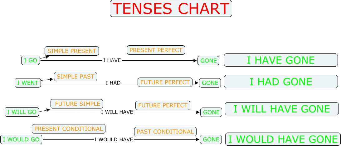 Questa Mappa Concettuale ha informazioni correlate a: TENSES CHART, I WENT ???? SIMPLE PAST, I WENT I HAD GONE, I GO I HAVE GONE, I WOULD GO I WOULD HAVE GONE, I WILL GO I WILL HAVE GONE, I WILL GO ???? FUTURE SIMPLE, I GO ???? SIMPLE PRESENT