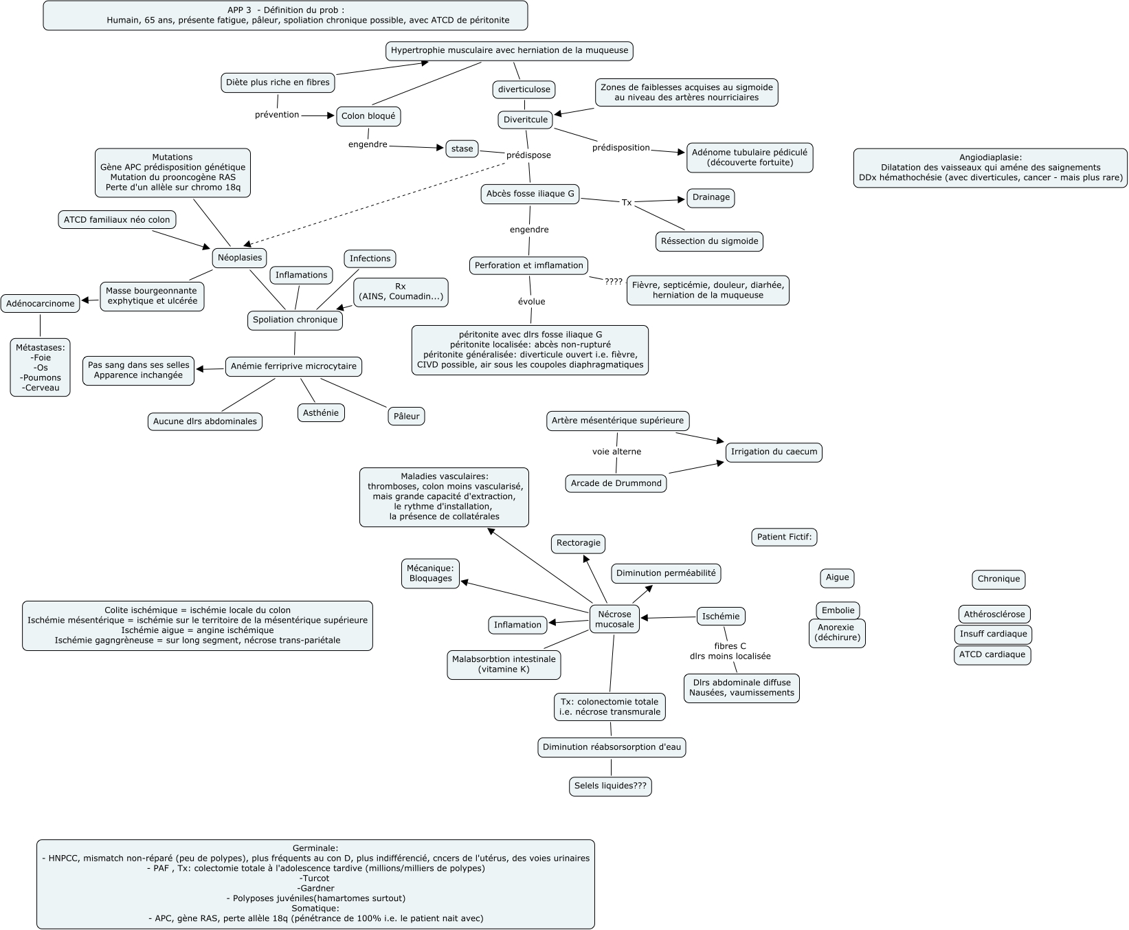 This Concept Map, created with IHMC CmapTools, has information related to: APP3 - Aller, Hypertrophie musculaire avec herniation de la muqueuse Colon bloqué, Nécrose mucosale Rectoragie, Abcès fosse iliaque G Tx Drainage, Rx (AINS, Coumadin...) Spoliation chronique, Néoplasies Masse bourgeonnante exphytique et ulcérée, Artère mésentérique supérieure Irrigation du caecum, Arcade de Drummond Irrigation du caecum, Nécrose mucosale Diminution perméabilité, Anémie ferriprive microcytaire Asthénie, Nécrose mucosale Malabsorbtion intestinale (vitamine K), Adénocarcinome Métastases: -Foie -Os -Poumons -Cerveau, Perforation et imflamation évolue péritonite avec dlrs fosse iliaque G péritonite localisée: abcès non-rupturé péritonite généralisée: diverticule ouvert i.e. fièvre, CIVD possible, air sous les coupoles diaphragmatiques, Anémie ferriprive microcytaire Pâleur, ATCD familiaux néo colon Néoplasies, Abcès fosse iliaque G engendre Perforation et imflamation, Inflamations Spoliation chronique, Ischémie fibres C dlrs moins localisée Dlrs abdominale diffuse Nausées, vaumissements, Anémie ferriprive microcytaire Pas sang dans ses selles Apparence inchangée, Masse bourgeonnante exphytique et ulcérée Adénocarcinome, Perforation et imflamation ???? Fièvre, septicémie, douleur, diarhée, herniation de la muqueuse