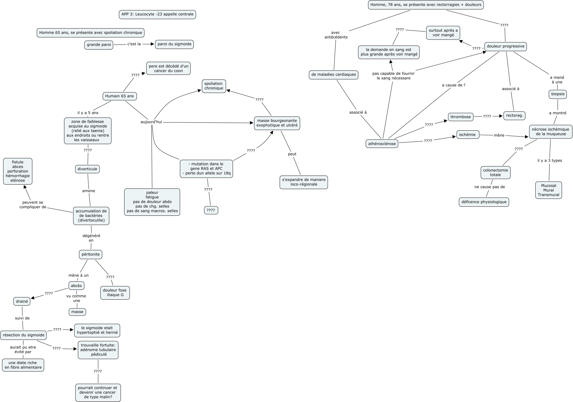 This Concept Map, created with IHMC CmapTools, has information related to: app3-aller, masse bourgeonante exophytique et ulcéré ???? spoliation chronique, Humain 65 ans aujourd'hui paleur fatigue pas de douleur abdo pas de chg. selles pas de sang macros. selles, accumulation de de bactéries (divertoculite) peuvent se compliquer de fistule abces perforation hémorrhagie sténose, douleur progressive associé à rectorag., zone de faiblesse acquise au sigmoide (relié aux taenia) aux endroits ou rentre les vaisseaux ???? diverticule, surtout après a voir mangé ???? la demande en sang est plus grande après voir mangé, Humain 65 ans aujourd'hui spoliation chronique, thrombose ???? rectorag., douleur progressive a mené à une biopsie, diverticule amene accumulation de de bactéries (divertoculite), résection du sigmoide ???? le sigmoide etait hypertophié et hernié, masse bourgeonante exophytique et ulcéré peut s'expandre de maniere loco-régionale, Humain 65 ans ???? pere est décédé d'un cancer du coon, de maladies cardiaques associé à athérosclérose, douleur progressive a cause de l' athérosclérose, Humain 65 ans aujourd'hui - mutation dans le gene RAS et APC - perte dun allele sur 18q, Homme, 78 ans, se présente avec rectorragies + douleurs avec antécédents de maladies cardiaques, colonectomie totale ne cause pas de déficence physiologique, accumulation de de bactéries (divertoculite) dégénéré en péritonite, nécrose ischémique de la muqueuse il y a 3 types Mucosal Mural Transmural