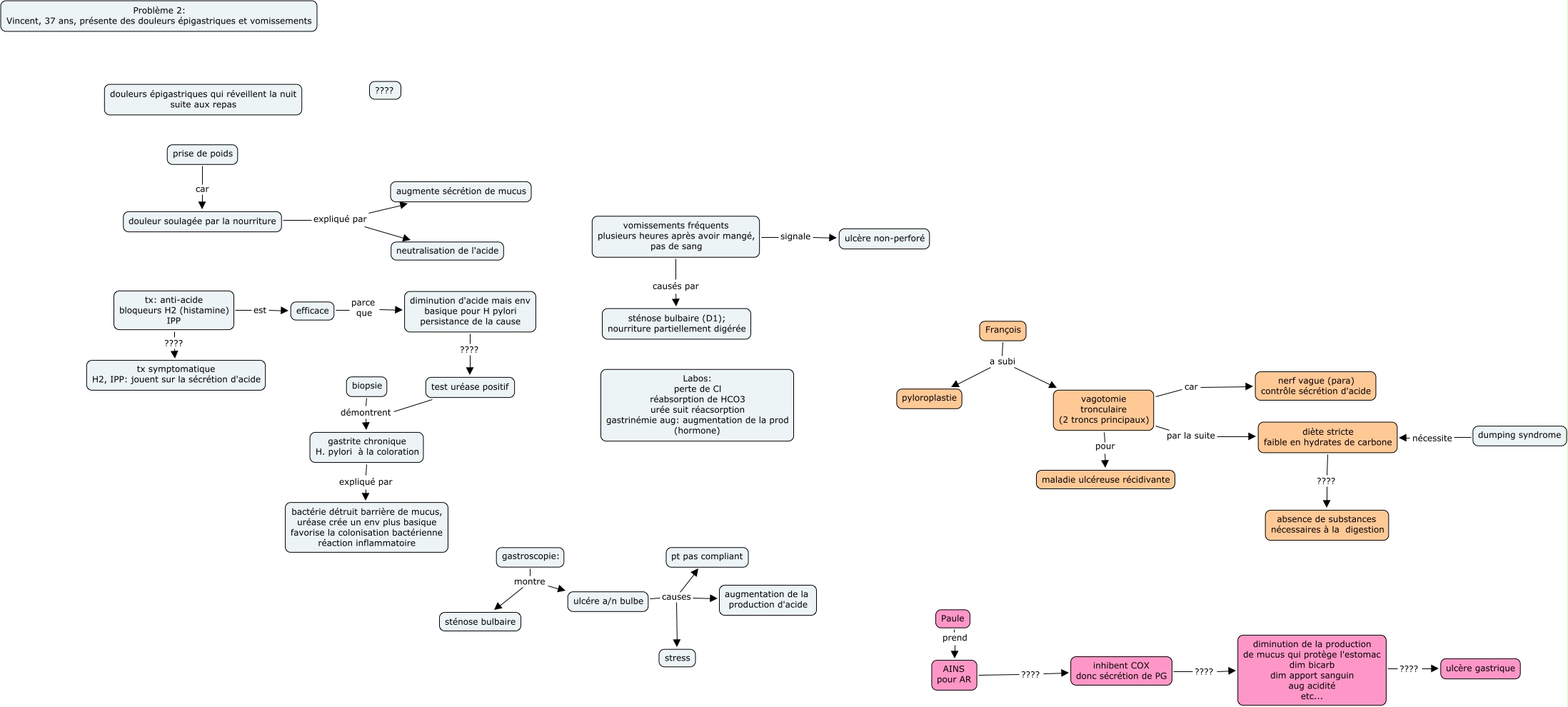 This Concept Map, created with IHMC CmapTools, has information related to: app2 final, dumping syndrome nécessite diète stricte faible en hydrates de carbone, vagotomie tronculaire (2 troncs principaux) pour maladie ulcéreuse récidivante, vomissements fréquents plusieurs heures après avoir mangé, pas de sang signale ulcère non-perforé, diminution d'acide mais env basique pour H pylori persistance de la cause ???? test uréase positif, diminution de la production de mucus qui protège l'estomac dim bicarb dim apport sanguin aug acidité etc... ???? ulcère gastrique, vagotomie tronculaire (2 troncs principaux) par la suite diète stricte faible en hydrates de carbone, AINS pour AR ???? inhibent COX donc sécrétion de PG, ulcére a/n bulbe causes pt pas compliant, vagotomie tronculaire (2 troncs principaux) car nerf vague (para) contrôle sécrétion d'acide, diète stricte faible en hydrates de carbone ???? absence de substances nécessaires à la digestion, François a subi pyloroplastie, François a subi vagotomie tronculaire (2 troncs principaux), ulcére a/n bulbe causes stress, inhibent COX donc sécrétion de PG ???? diminution de la production de mucus qui protège l'estomac dim bicarb dim apport sanguin aug acidité etc..., gastroscopie: montre ulcére a/n bulbe, ulcére a/n bulbe causes augmentation de la production d'acide, vomissements fréquents plusieurs heures après avoir mangé, pas de sang causés par sténose bulbaire (D1); nourriture partiellement digérée, gastroscopie: montre sténose bulbaire, douleur soulagée par la nourriture expliqué par neutralisation de l'acide, douleur soulagée par la nourriture expliqué par augmente sécrétion de mucus