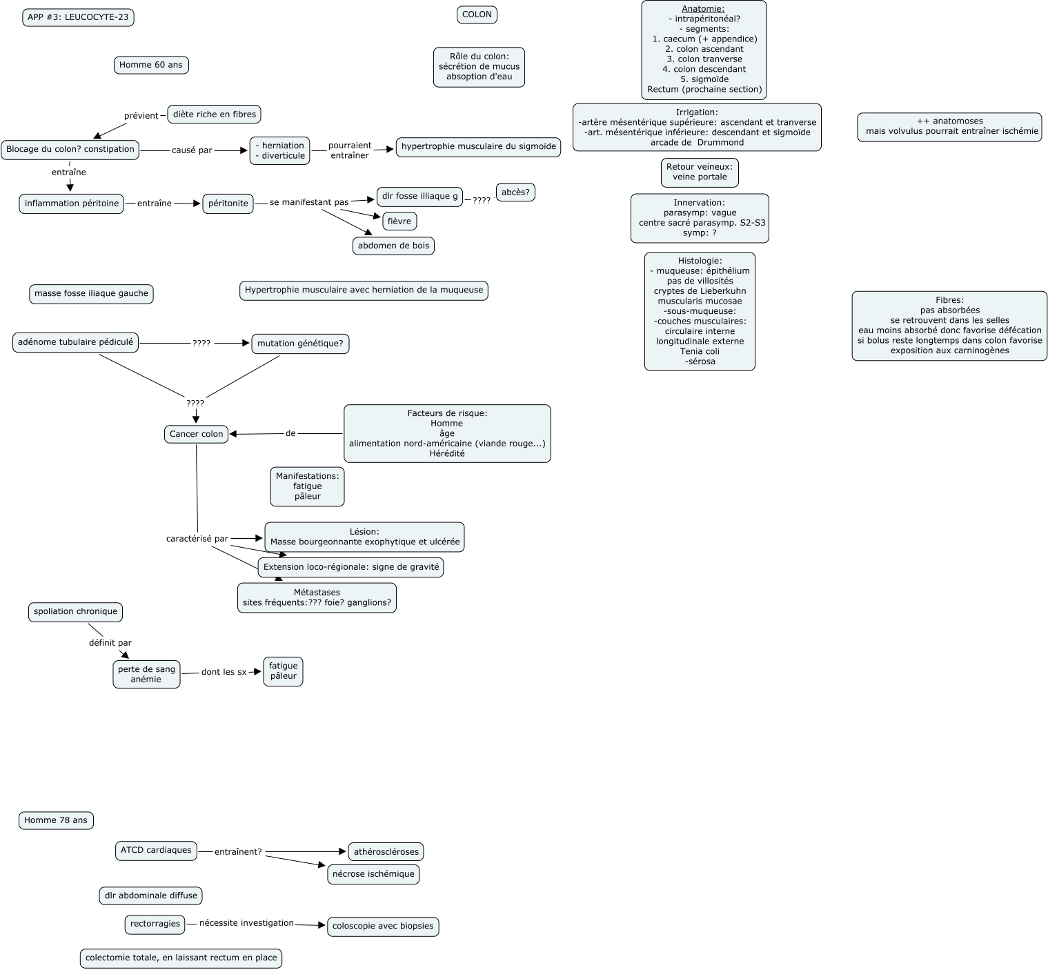 This Concept Map, created with IHMC CmapTools, has information related to: app3 naïf, Blocage du colon? constipation causé par - herniation - diverticule, rectorragies nécessite investigation coloscopie avec biopsies, Facteurs de risque: Homme âge alimentation nord-américaine (viande rouge...) Hérédité de Cancer colon, dlr fosse illiaque g ???? abcès?, - herniation - diverticule pourraient entraîner hypertrophie musculaire du sigmoïde, péritonite se manifestant pas dlr fosse illiaque g, adénome tubulaire pédiculé ???? Cancer colon, spoliation chronique définit par perte de sang anémie, péritonite se manifestant pas abdomen de bois, ATCD cardiaques entraînent? athéroscléroses, Blocage du colon? constipation entraîne inflammation péritoine, Cancer colon caractérisé par Lésion: Masse bourgeonnante exophytique et ulcérée, péritonite se manifestant pas fièvre, adénome tubulaire pédiculé ???? mutation génétique?, ATCD cardiaques entraînent? nécrose ischémique, inflammation péritoine entraîne péritonite, perte de sang anémie dont les sx fatigue pâleur, Cancer colon caractérisé par Métastases sites fréquents:??? foie? ganglions?, Cancer colon caractérisé par Extension loco-régionale: signe de gravité, diète riche en fibres prévient Blocage du colon? constipation