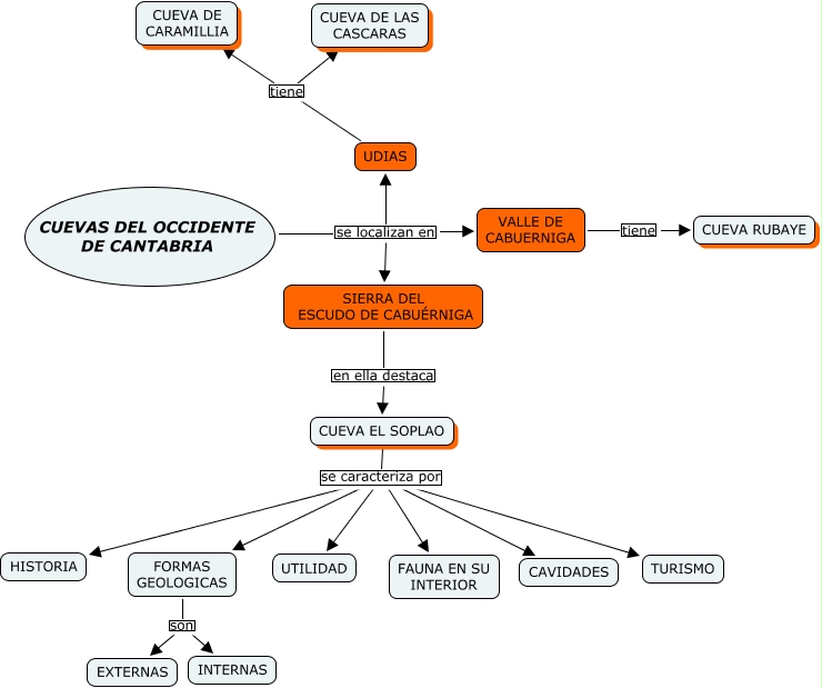 CUEVAS, SIERRA DEL ESCUDO DE CABUÉRNIGA en ella destaca CUEVA EL SOPLAO, CUEVA EL SOPLAO se caracteriza por FORMAS GEOLOGICAS, CUEVAS DEL OCCIDENTE DE CANTABRIA se localizan en SIERRA DEL ESCUDO DE CABUÉRNIGA, FORMAS GEOLOGICAS son INTERNAS, CUEVAS DEL OCCIDENTE DE CANTABRIA se localizan en VALLE DE CABUERNIGA, VALLE DE CABUERNIGA tiene CUEVA RUBAYE, CUEVA EL SOPLAO se caracteriza por FAUNA EN SU INTERIOR, CUEVA EL SOPLAO se caracteriza por CAVIDADES, CUEVAS DEL OCCIDENTE DE CANTABRIA se localizan en UDIAS, CUEVA EL SOPLAO se caracteriza por HISTORIA