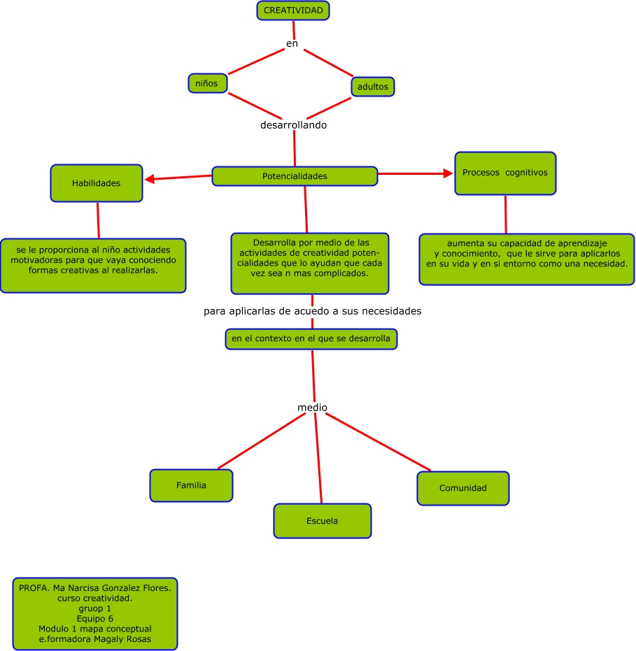 Este Cmap, tiene información relacionada con: Maria Oliva Lucena, CREATIVIDAD en adultos, niños desarrollando Potencialidades, Desarrolla por medio de las actividades de creatividad poten- cialidades que lo ayudan que cada vez sea n mas complicados. para aplicarlas de acuedo a sus necesidades en el contexto en el que se desarrolla, Habilidades ???? se le proporciona al niño actividades motivadoras para que vaya conociendo formas creativas al realizarlas., en el contexto en el que se desarrolla medio Familia, Procesos cognitivos ???? aumenta su capacidad de aprendizaje y conocimiento, que le sirve para aplicarlos en su vida y en si entorno como una necesidad., en el contexto en el que se desarrolla medio Comunidad, adultos desarrollando Potencialidades, Potencialidades Procesos cognitivos, Potencialidades ???? Habilidades, en el contexto en el que se desarrolla medio Escuela, Potencialidades ???? ????, CREATIVIDAD en niños