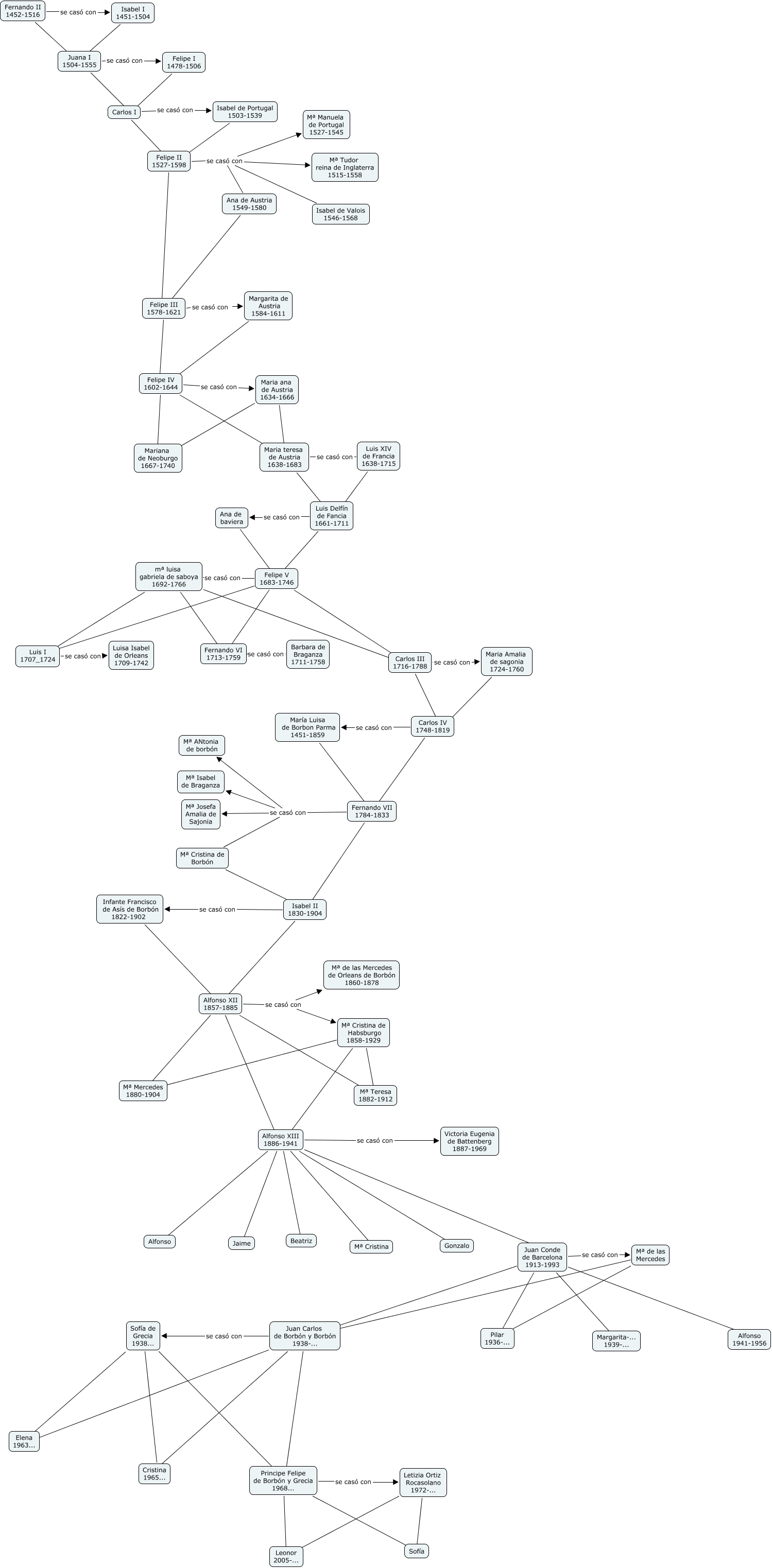 Este mapa conceptual tiene información relacionada a: mario y gema arbol genealogico, Juana I 1504-1555 se casó con Felipe I 1478-1506, Sofía de Grecia 1938... ???? Elena 1963..., Felipe V 1683-1746 se casó con mª luisa gabriela de saboya 1692-1766, Alfonso XII 1857-1885 se casó con Mª de las Mercedes de Orleans de Borbón 1860-1878, Maria teresa de Austria 1638-1683 ???? Luis Delfín de Fancia 1661-1711, Juana I 1504-1555 ???? Carlos I, Infante Francisco de Asís de Borbón 1822-1902 ???? Alfonso XII 1857-1885, mª luisa gabriela de saboya 1692-1766 ???? Carlos III 1716-1788, Carlos III 1716-1788 se casó con Maria Amalia de sagonia 1724-1760, Isabel II 1830-1904 ???? Alfonso XII 1857-1885, Principe Felipe de Borbón y Grecia 1968... ???? Sofía, Luis Delfín de Fancia 1661-1711 se casó con Ana de baviera, Margarita de Austria 1584-1611 ???? Felipe IV 1602-1644, Felipe IV 1602-1644 ???? Maria teresa de Austria 1638-1683, Isabel I 1451-1504 ???? Juana I 1504-1555, Principe Felipe de Borbón y Grecia 1968... se casó con Letizia Ortiz Rocasolano 1972-..., Fernando VII 1784-1833 ???? Isabel II 1830-1904, Juan Carlos de Borbón y Borbón 1938-... ???? Cristina 1965..., Fernando VII 1784-1833 se casó con Mª Josefa Amalia de Sajonia, Felipe V 1683-1746 ???? Luis I 1707_1724