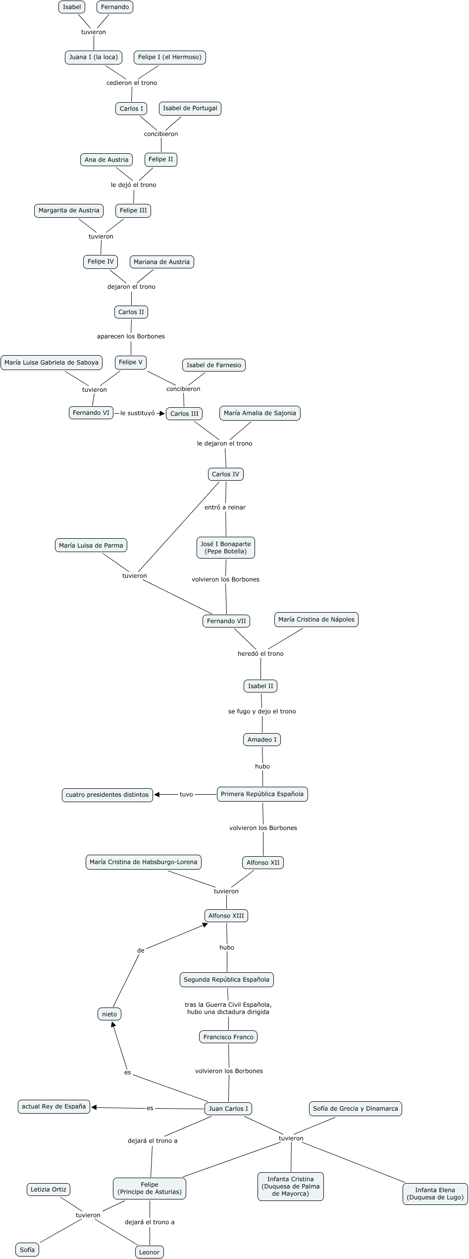 Este mapa conceptual tiene información relacionada a: 17.Carlos Rodríguez Daza-dinastía española, María Cristina de Habsburgo-Lorena tuvieron Alfonso XIII, Felipe V tuvieron Fernando VI, María Amalia de Sajonia le dejaron el trono Carlos IV, Fernando VI le sustituyó Carlos III, Fernando tuvieron Juana I (la loca), Primera República Española volvieron los Borbones Alfonso XII, María Luisa Gabriela de Saboya tuvieron Fernando VI, María Luisa de Parma tuvieron Fernando VII, Segunda República Española tras la Guerra Civil Española, hubo una dictadura dirigida Francisco Franco, Juan Carlos I dejará el trono a Felipe (Principe de Asturias), Carlos I concibieron Felipe II, Juana I (la loca) cedieron el trono Carlos I, Isabel de Portugal concibieron Felipe II, Letizia Ortiz tuvieron Sofía, Juan Carlos I tuvieron Infanta Cristina (Duquesa de Palma de Mayorca), Isabel II se fugo y dejo el trono Amadeo I, Alfonso XII tuvieron Alfonso XIII, Carlos III le dejaron el trono Carlos IV, Juan Carlos I es nieto, José I Bonaparte (Pepe Botella) volvieron los Borbones Fernando VII