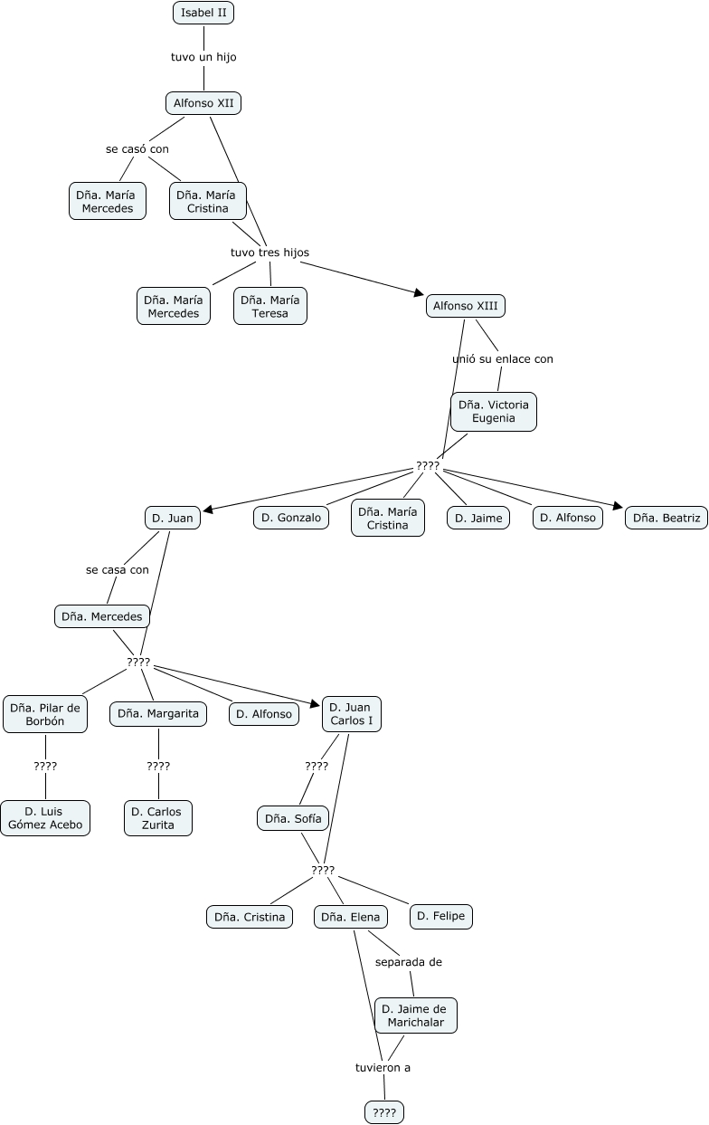 Este mapa conceptual tiene información relacionada a: reyes españa esther y cristina, Isabel II tuvo un hijo Alfonso XII, Dña. Victoria Eugenia ???? D. Juan, D. Juan se casa con Dña. Mercedes, Dña. Elena tuvieron a ????, Dña. Mercedes ???? Dña. Margarita, D. Juan ???? Dña. Pilar de Borbón, Alfonso XIII ???? Dña. Beatriz, Dña. María Cristina tuvo tres hijos Dña. María Teresa, D. Juan Carlos I ???? Dña. Elena, D. Juan Carlos I ???? D. Felipe