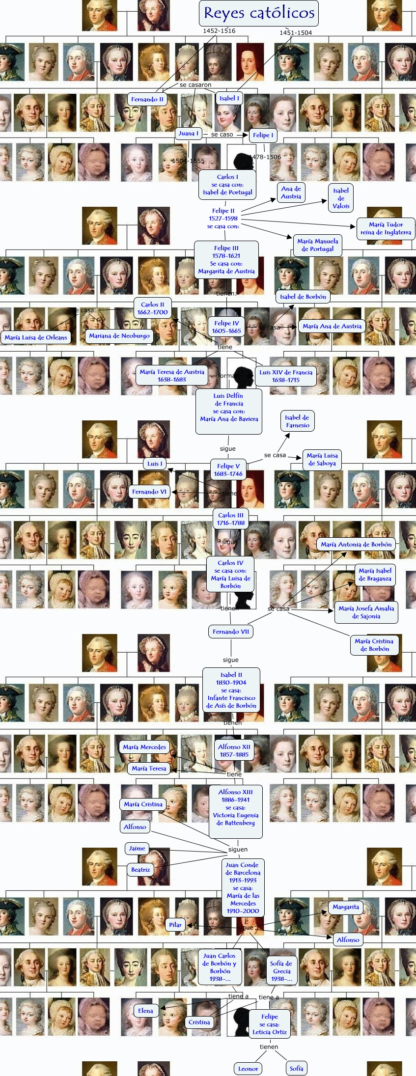 Este mapa conceptual tiene información relacionada a: Marina Jiménez Pérez, Felipe V 1683-1746 tiene Carlos III 1716-1788, Felipe IV 1605-1665 se casa Isabel de Borbón, Juana I se caso Felipe I, María Cristina siguen Juan Conde de Barcelona 1913-1993 se casa: María de las Mercedes 1910-2000, Felipe IV 1605-1665 se casa María Ana de Austria, Juan Carlos de Borbón y Borbón 1938-... tiene a Cristina, Isabel II 1830-1904 se casa: Infante Francisco de Asís de Borbón tienen Alfonso XII 1857-1885, Felipe IV 1605-1665 tiene María Teresa de Austria 1638-1683, Carlos II 1662-1700 se casa María Luisa de Orleans, Sofía de Grecia 1938-... tiene a Felipe se casa: Leticia Ortiz, Reyes católicos 1452-1516 Fernando II, Carlos I se casa con: Isabel de Portugal Felipe II 1527-1598 se casa con: Ana de Austria, Alfonso siguen Juan Conde de Barcelona 1913-1993 se casa: María de las Mercedes 1910-2000, Carlos II 1662-1700 se casa Mariana de Neoburgo, Felipe V 1683-1746 se casa Isabel de Farnesio, Fernando II se casaron Juana I, Beatriz siguen Juan Conde de Barcelona 1913-1993 se casa: María de las Mercedes 1910-2000, Felipe IV 1605-1665 tiene Luis XIV de Francia 1638-1715, Luis Delfín de Francia se casa con: María Ana de Baviera sigue Felipe V 1683-1746, Felipe se casa: Leticia Ortiz tienen Sofía