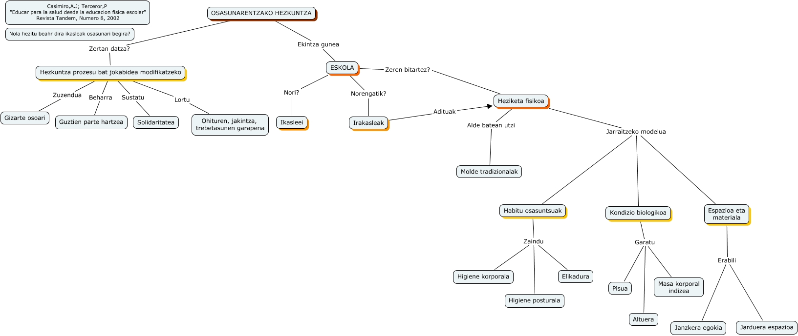 Este mapa conceptual tiene información relacionada a: jonan1, Espazioa eta materiala Erabili Jarduera espazioa, Heziketa fisikoa Jarraitzeko modelua Espazioa eta materiala, Kondizio biologikoa Garatu Masa korporal indizea, Hezkuntza prozesu bat jokabidea modifikatzeko Zuzendua Gizarte osoari, Hezkuntza prozesu bat jokabidea modifikatzeko Beharra Guztien parte hartzea, OSASUNARENTZAKO HEZKUNTZA Zertan datza? Hezkuntza prozesu bat jokabidea modifikatzeko, Habitu osasuntsuak Zaindu Elikadura, OSASUNARENTZAKO HEZKUNTZA Ekintza gunea ESKOLA, Irakasleak Adituak Heziketa fisikoa, Kondizio biologikoa Garatu Altuera