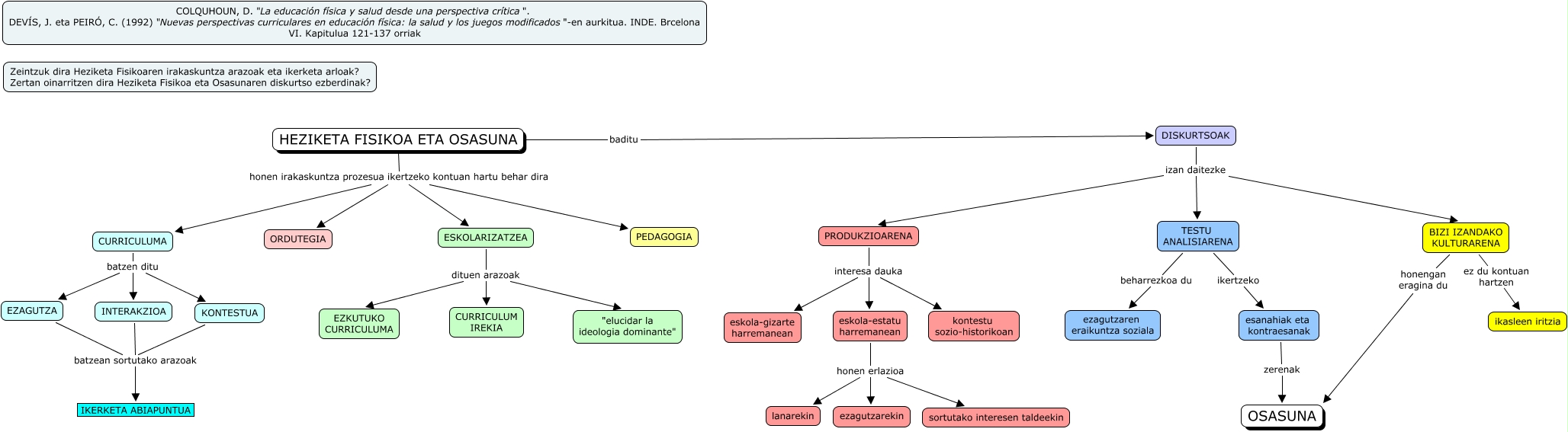 Este mapa conceptual tiene información relacionada a: endika3, HEZIKETA FISIKOA ETA OSASUNA honen irakaskuntza prozesua ikertzeko kontuan hartu behar dira PEDAGOGIA, KONTESTUA batzean sortutako arazoak IKERKETA ABIAPUNTUA, eskola-estatu harremanean honen erlazioa sortutako interesen taldeekin, CURRICULUMA batzen ditu KONTESTUA, eskola-estatu harremanean honen erlazioa lanarekin, DISKURTSOAK izan daitezke TESTU ANALISIARENA, INTERAKZIOA batzean sortutako arazoak IKERKETA ABIAPUNTUA, ESKOLARIZATZEA dituen arazoak EZKUTUKO CURRICULUMA, EZAGUTZA batzean sortutako arazoak IKERKETA ABIAPUNTUA, CURRICULUMA batzen ditu EZAGUTZA