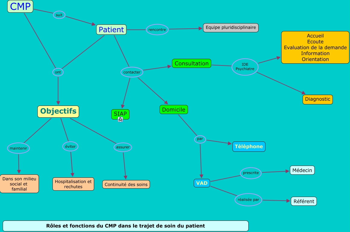 This Concept Map has information related to: CMP-Missions, Objectifs assurer Continuité des soins, Patient rencontre Equipe pluridisciplinaire, Domicile par Téléphone, CMP suit Patient, Objectifs maintenir Dans son milieu social et familial, Domicile par VAD, Patient contacter SIAP, Objectifs éviter Hospitalisation et rechutes, Consultation IDE Psychiatre Diagnostic, VAD prescrite Médecin