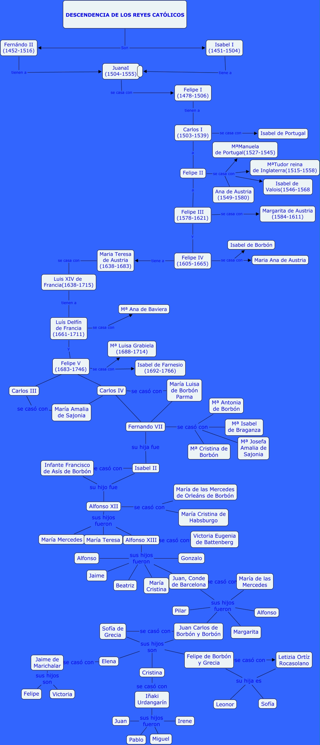 Este mapa conceptual tiene información relacionada a: 09.Sonia de Prado Baños.Árbol Genealógico, Alfonso XIII se casó con Victoria Eugenia de Battenberg, María de las Mercedes sus hijos fueron Margarita, Felipe II se casa con Isabel de Valois(1546-1568, Carlos I (1503-1539) a Felipe II, Iñaki Urdangarín sus hijos fueron Juan, Alfonso XII sus hijos fueron Alfonso XIII, María de las Mercedes sus hijos fueron Alfonso, Alfonso XIII sus hijos fueron Beatriz, Isabel II su hijo fue Alfonso XII, Felipe V (1683-1746) se casa con Isabel de Farnesio (1692-1766), Infante Francisco de Asís de Borbón su hijo fue Alfonso XII, Felipe I (1478-1506) tienen a Carlos I (1503-1539), Carlos III ???? Carlos IV, Juan, Conde de Barcelona se casó con María de las Mercedes, Sofía de Grecia sus hijos son Felipe de Borbón y Grecia, Jaime de Marichalar sus hijos son Felipe, Fernando VII su hija fue Isabel II, Alfonso XII se casó con María de las Mercedes de Orleáns de Borbón, Fernando VII se casó con Mª Josefa Amalia de Sajonia, Felipe de Borbón y Grecia se casó con Letizia Ortíz Rocasolano