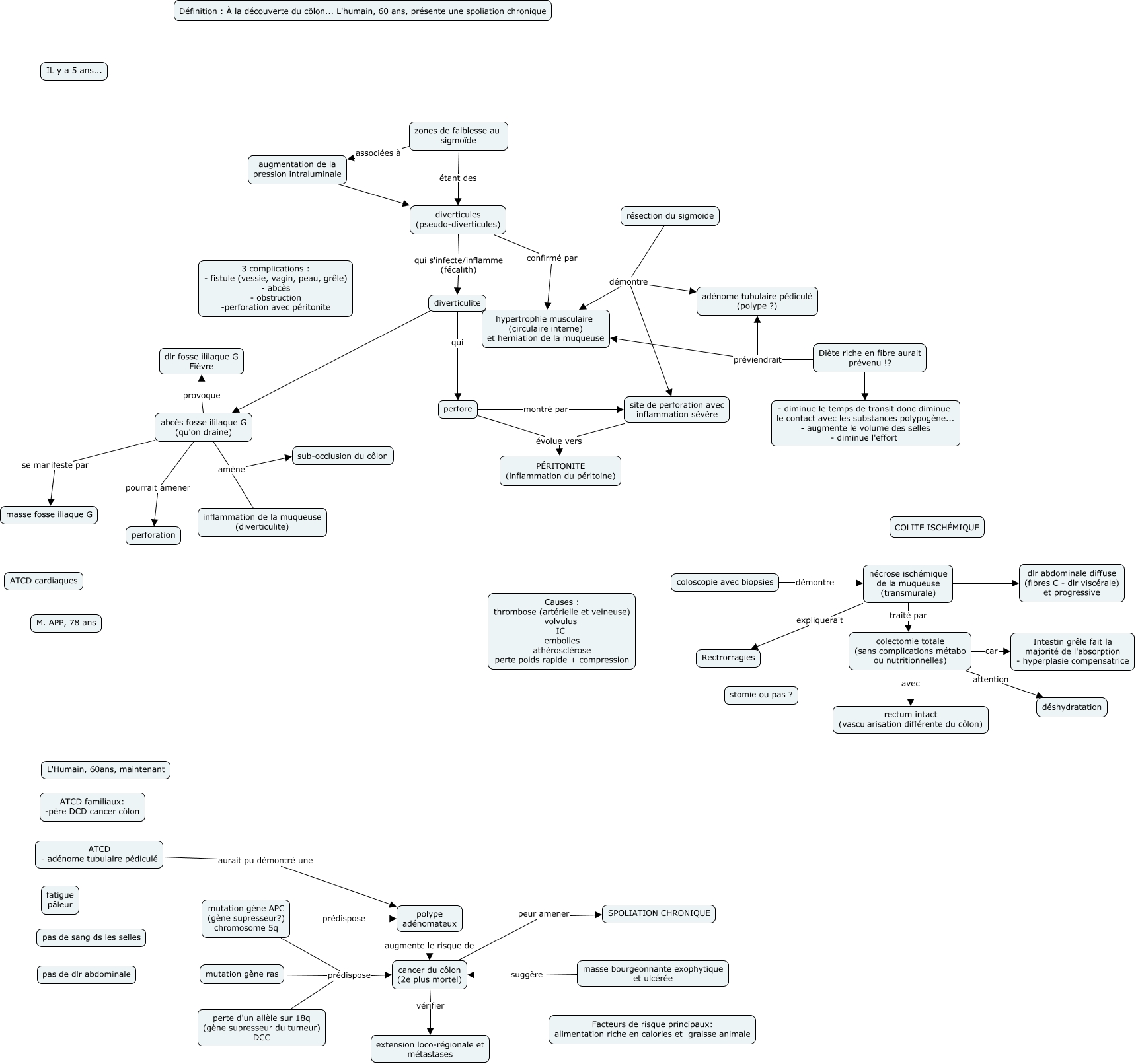 Cette carte de concepts créée avec IHMC CmapTools traite de: app3-final, nécrose ischémique de la muqueuse (transmurale) expliquerait Rectrorragies, cancer du côlon (2e plus mortel) peur amener SPOLIATION CHRONIQUE, colectomie totale (sans complications métabo ou nutritionnelles) car Intestin grêle fait la majorité de l'absorption - hyperplasie compensatrice, mutation gène ras prédispose cancer du côlon (2e plus mortel), colectomie totale (sans complications métabo ou nutritionnelles) attention déshydratation, abcès fosse ililaque G (qu'on draine) provoque dlr fosse ililaque G Fièvre, site de perforation avec inflammation sévère évolue vers PÉRITONITE (inflammation du péritoine), Diète riche en fibre aurait prévenu !? préviendrait hypertrophie musculaire (circulaire interne) et herniation de la muqueuse, diverticulite ???? abcès fosse ililaque G (qu'on draine), inflammation de la muqueuse (diverticulite) amène sub-occlusion du côlon, résection du sigmoïde démontre site de perforation avec inflammation sévère, abcès fosse ililaque G (qu'on draine) se manifeste par masse fosse iliaque G, perfore évolue vers PÉRITONITE (inflammation du péritoine), diverticules (pseudo-diverticules) qui s'infecte/inflamme (fécalith) diverticulite, ATCD - adénome tubulaire pédiculé aurait pu démontré une polype adénomateux, mutation gène APC (gène supresseur?) chromosome 5q prédispose polype adénomateux, augmentation de la pression intraluminale ???? diverticules (pseudo-diverticules), abcès fosse ililaque G (qu'on draine) pourrait amener perforation, perfore montré par site de perforation avec inflammation sévère, colectomie totale (sans complications métabo ou nutritionnelles) avec rectum intact (vascularisation différente du côlon)