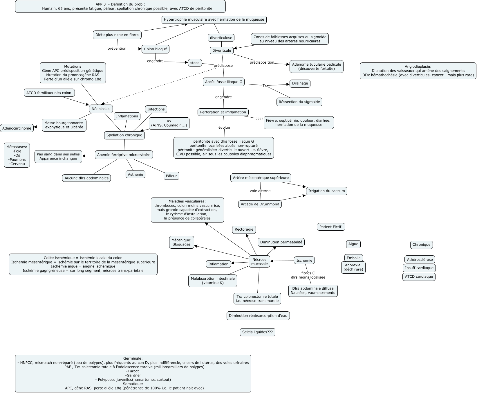 Cette carte de concepts créée avec IHMC CmapTools traite de: APP3 - Retour, Rx (AINS, Coumadin...) Spoliation chronique, Abcès fosse iliaque G Tx Drainage, Nécrose mucosale Rectoragie, Hypertrophie musculaire avec herniation de la muqueuse Colon bloqué, Néoplasies Masse bourgeonnante exphytique et ulcérée, Artère mésentérique supérieure Irrigation du caecum, Arcade de Drummond Irrigation du caecum, Anémie ferriprive microcytaire Asthénie, Nécrose mucosale Diminution perméabilité, Nécrose mucosale Malabsorbtion intestinale (vitamine K), Adénocarcinome Métastases: -Foie -Os -Poumons -Cerveau, Perforation et imflamation évolue péritonite avec dlrs fosse iliaque G péritonite localisée: abcès non-rupturé péritonite généralisée: diverticule ouvert i.e. fièvre, CIVD possible, air sous les coupoles diaphragmatiques, ATCD familiaux néo colon Néoplasies, Anémie ferriprive microcytaire Pâleur, Ischémie fibres C dlrs moins localisée Dlrs abdominale diffuse Nausées, vaumissements, Inflamations Spoliation chronique, Abcès fosse iliaque G engendre Perforation et imflamation, Anémie ferriprive microcytaire Pas sang dans ses selles Apparence inchangée, Mutations Gène APC prédisposition génétique Mutation du prooncogène RAS Perte d'un allèle sur chromo 18q Néoplasies, Diveritcule prédispose Abcès fosse iliaque G
