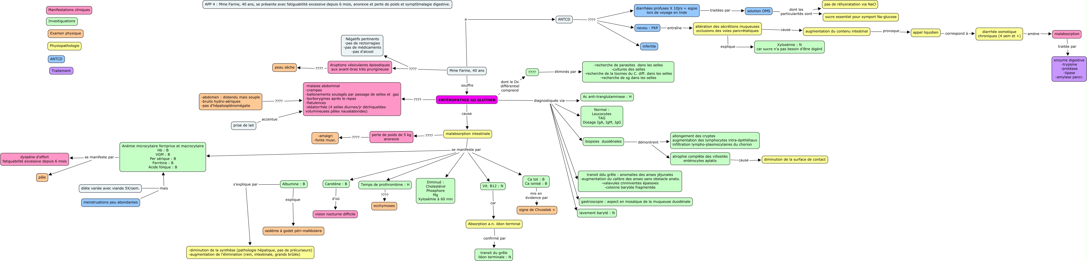 App 4 aller2, malabsorption intestinale ???? perte de poids de 5 kg anorexie, ENTÉROPATHIE AU GLUTHEN cause malabsorption intestinale, biopsies duodénales démontrent atrophie complète des villosités entérocytes aplatis, Ca tot : B Ca ionisé : B mis en évidence par signe de Chvostek +, malabsorption traitée par enzyme digestive -trypsine -protéase -lipase -amylase pancr., Vit. B12 : N car Absorption a.n. iléon terminal, Temps de prothrombine : H ???? ecchymoses, solution OMS dont les particularités sont pas de réhysratation via NaCl, diarrhée osmotique chroniques (4 sem et +) amène malabsorption, Albumine : B s'explique par -diminution de la synthèse (pathologie hépatique, pas de précurseurs) -augmentation de l'élimination (rein, intestinale, grands brûlés)