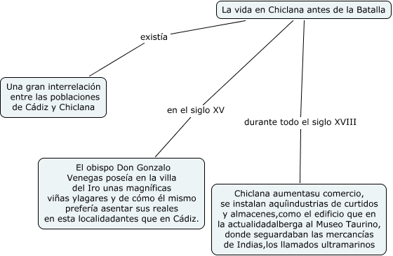 Este mapa conceptual tiene información relacionada a: 05.Isabel Chozas Rendón.Chiclana antes de la Batalla, La vida en Chiclana antes de la Batalla en el siglo XV El obispo Don Gonzalo Venegas poseía en la villa del Iro unas magníficas viñas ylagares y de cómo él mismo prefería asentar sus reales en esta localidadantes que en Cádiz., La vida en Chiclana antes de la Batalla existía Una gran interrelación entre las poblaciones de Cádiz y Chiclana, La vida en Chiclana antes de la Batalla durante todo el siglo XVIII Chiclana aumentasu comercio, se instalan aquíindustrias de curtidos y almacenes,como el edificio que en la actualidadalberga al Museo Taurino, donde seguardaban las mercancías de Indias,los llamados ultramarinos