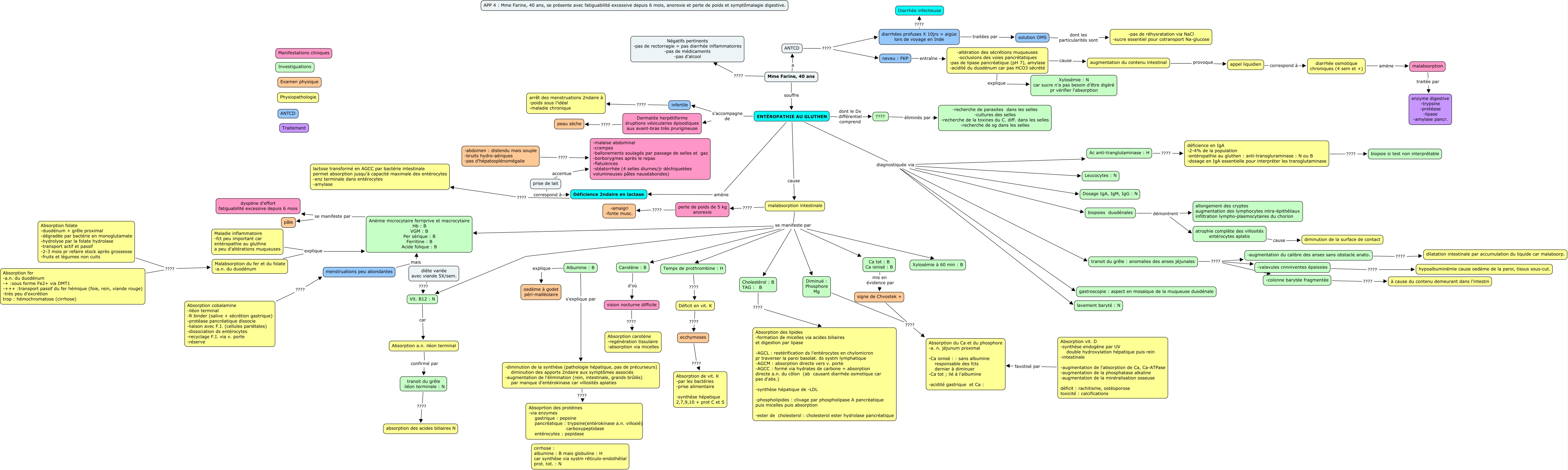 This Concept Map, created with IHMC CmapTools, has information related to: appp4 retour, -altération des sécrétions muqueuses -occlusions des voies pancrétatiques -pas de lipase pancréatique (pH 7), amylase -acidité du duodénum car pas HCO3 sécrété cause augmentation du contenu intestinal, Anémie microcytaire ferriprive et macrocytaire Hb : B VGM : B Per sérique : B Ferritine : B Acide folique : B se manifeste par dyspéne d'effort fatiguabilité excessive depuis 6 mois, Temps de prothrombine : H ???? Déficit en vit. K, ENTÉROPATHIE AU GLUTHEN diagnostiquée via transit du grêle : anomalies des anses jéjunales, solution OMS dont les particularités sont -pas de réhysratation via NaCl -sucre essentiel pour cotransport Na-glucose, biopsies duodénales démontrent allongement des cryptes augmentation des lymphocytes intra-épithéliaux infiltration lympho-plasmocytaires du chorion, Absorption fer -a.n. du duodénum -+ :sous forme Fe2+ via DMT1 -+++ :transport passif du fer hémique (foie, rein, viande rouge) -très peu d'excrétion trop : hémochromatose (cirrhose) ???? Malabsorption du fer et du folate -a.n. du duodénum, Anémie microcytaire ferriprive et macrocytaire Hb : B VGM : B Per sérique : B Ferritine : B Acide folique : B se manifeste par pâle, Ca tot : B Ca ionisé : B mis en évidence par signe de Chvostek +, signe de Chvostek + ???? Absorption du Ca et du phosphore -a. n. jéjunum proximal -Ca ionisé : : sans albumine responsable des fcts dernier à diminuer -Ca tot ; lié à l'albumine -acidité gastrique et Ca :, Mme Farine, 40 ans a ANTCD, ANTCD ???? neveu : FKP, Cholestérol : B TAG : B ???? Absorption des lipides -formation de micelles via acides biliaires et digestion par lipase -AGCL : restérification ds l'entérocytes en chylomicron pr traverser la paroi basolat. ds systm lymphatique -AGCM : absorption directe vers v. porte -AGCC : formé via hydrates de carbone + absorption directe a.n. du côlon (ab causant diarrhée osmotique car pas d'abs.) -synthèse hépatique de -LDL -phospholipides : clivage par phospholipase A pancréatique puis micelles puis absorption -ester de cholesterol : cholesterol ester hydrolase pancréatique, malabsorption intestinale ???? perte de poids de 5 kg anorexie, -colonne barytée fragmentée ???? à cause du contenu demeurant dans l'intestin, Ac anti-tranglutaminase : H ???? déficience en IgA -2-4% de la population -entéropathie au gluthen : anti-transgluraminase : N ou B -dosage en IgA essentielle pour interpréter les transglutaminase, déficience en IgA -2-4% de la population -entéropathie au gluthen : anti-transgluraminase : N ou B -dosage en IgA essentielle pour interpréter les transglutaminase ???? biopsie si test non interprétable, diète variée avec viande 5X/sem. mais Anémie microcytaire ferriprive et macrocytaire Hb : B VGM : B Per sérique : B Ferritine : B Acide folique : B, Mme Farine, 40 ans ???? Négatifs pertinents -pas de rectorragie = pas diarrhée inflammatoires -pas de médicaments -pas d'alcool, diète variée avec viande 5X/sem. ???? Vit. B12 : N