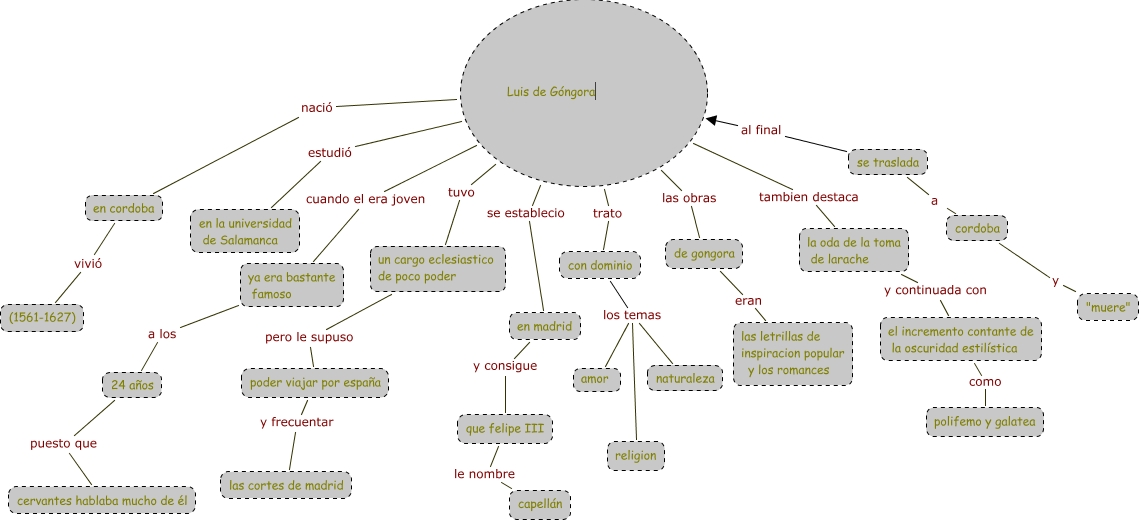 Este Cmap, tiene información relacionada con: Sin Título 1, Luis de Góngora nació en cordoba, en cordoba vivió (1561-1627), la oda de la toma de larache y continuada con el incremento contante de la oscuridad estilística, que felipe III le nombre capellán, 24 años puesto que cervantes hablaba mucho de él, Luis de Góngora cuando el era joven ya era bastante famoso, poder viajar por españa y frecuentar las cortes de madrid, ya era bastante famoso a los 24 años, Luis de Góngora estudió en la universidad de Salamanca, Luis de Góngora las obras de gongora, de gongora eran las letrillas de inspiracion popular y los romances, se traslada al final Luis de Góngora, se traslada a cordoba, un cargo eclesiastico de poco poder pero le supuso poder viajar por españa, Luis de Góngora se establecio en madrid, con dominio los temas amor, Luis de Góngora trato con dominio, Luis de Góngora tambien destaca la oda de la toma de larache, con dominio los temas naturaleza, en madrid y consigue que felipe III