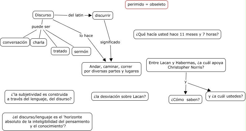 Este mapa conceptual tiene información relacionada a: 1 DISC, discurrir significado Andar, caminar, correr por diversas partes y lugares, Entre Lacan y Habermas, ¿a cuál apoya Christopher Norris? y y ¿a cuál ustedes?, Discurso lo hace Andar, caminar, correr por diversas partes y lugares, Discurso del latin discurrir, Discurso puede ser charla, Discurso puede ser conversación, Discurso puede ser tratado, Entre Lacan y Habermas, ¿a cuál apoya Christopher Norris? y ¿Cómo saben?, Discurso puede ser sermón