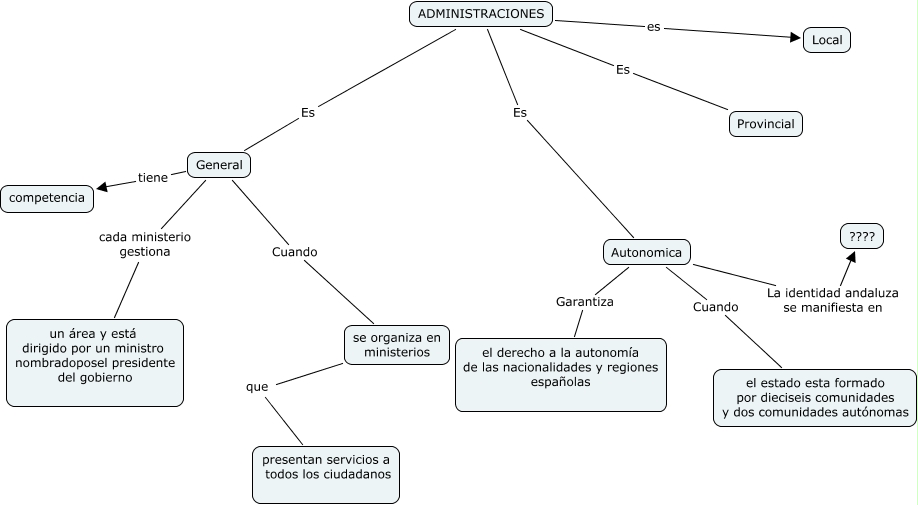 Este mapa conceptual tiene información relacionada a: marta salado cabeza de vaca, Autonomica Cuando el estado esta formado por dieciseis comunidades y dos comunidades autónomas, ADMINISTRACIONES Es Autonomica, Autonomica Garantiza el derecho a la autonomía de las nacionalidades y regiones españolas, ADMINISTRACIONES Es Provincial, se organiza en ministerios que presentan servicios a todos los ciudadanos, ADMINISTRACIONES Es General, General cada ministerio gestiona un área y está dirigido por un ministro nombradoposel presidente del gobierno, ADMINISTRACIONES es Local, General tiene competencia, General Cuando se organiza en ministerios