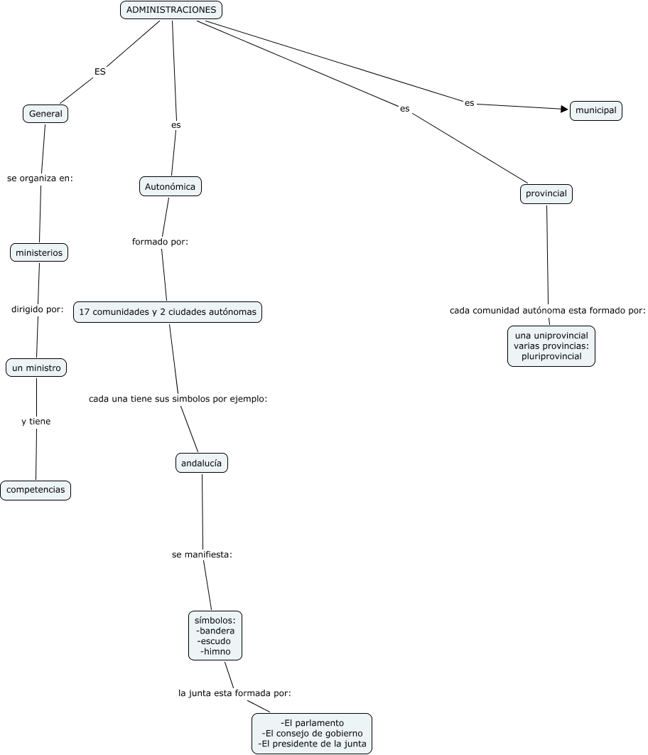 Este mapa conceptual tiene información relacionada a: cristina vázquez pérez, ministerios dirigido por: un ministro, 17 comunidades y 2 ciudades autónomas cada una tiene sus simbolos por ejemplo: andalucía, ADMINISTRACIONES es Autonómica, andalucía se manifiesta: símbolos: -bandera -escudo -himno, ADMINISTRACIONES ES General, símbolos: -bandera -escudo -himno la junta esta formada por: -El parlamento -El consejo de gobierno -El presidente de la junta, un ministro y tiene competencias, General se organiza en: ministerios, ADMINISTRACIONES es municipal, Autonómica formado por: 17 comunidades y 2 ciudades autónomas