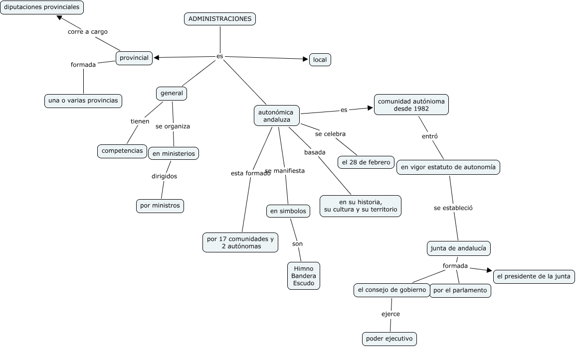 Este mapa conceptual tiene información relacionada a: marta marin pedrero, en simbolos son Himno Bandera Escudo, provincial corre a cargo diputaciones provinciales, general se organiza en ministerios, general tienen competencias, comunidad autónioma desde 1982 entró en vigor estatuto de autonomía, provincial formada una o varias provincias, autonómica andaluza se manifiesta en simbolos, autonómica andaluza basada en su historia, su cultura y su territorio, autonómica andaluza esta formado por 17 comunidades y 2 autónomas, autonómica andaluza es comunidad autónioma desde 1982