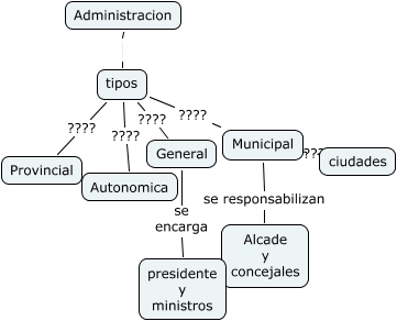 Este mapa conceptual tiene información relacionada a: Jose Maria Sanchez Garcia, Municipal ???? ciudades, tipos ???? Provincial, tipos ???? General, Municipal se responsabilizan Alcade y concejales, tipos ???? Autonomica, tipos ???? Municipal, General se encarga presidente y ministros, Administracion tipos