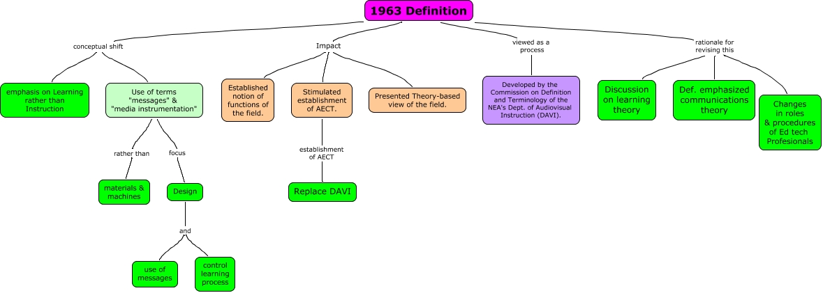 This Concept Map, created with IHMC CmapTools, has information related to: 1963 Definition, 1963 Definition Impact Presented Theory-based view of the field., Use of terms "messages" & "media instrumentation" focus Design, 1963 Definition Impact Stimulated establishment of AECT., 1963 Definition conceptual shift emphasis on Learning rather than Instruction, Stimulated establishment of AECT. establishment of AECT Replace DAVI, 1963 Definition rationale for revising this Changes in roles & procedures of Ed tech Profesionals, 1963 Definition rationale for revising this Discussion on learning theory, Design and control learning process, 1963 Definition Impact Established notion of functions of the field., 1963 Definition rationale for revising this Def. emphasized communications theory, 1963 Definition conceptual shift Use of terms "messages" & "media instrumentation", 1963 Definition viewed as a process Developed by the Commission on Definition and Terminology of the NEA's Dept. of Audiovisual Instruction (DAVI)., Use of terms "messages" & "media instrumentation" rather than materials & machines, Design and use of messages