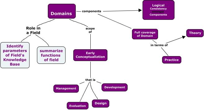 This Concept Map, created with IHMC CmapTools, has information related to: Domains1, Domains Role in a Field summarize functions of field, Domains scope of Early Conceptualiztion, Early Conceptualiztion that is Evaluation, Domains components Full coverage of Domain, Early Conceptualiztion that is Management, Early Conceptualiztion that is Design, Full coverage of Domain in terms of Theory, Full coverage of Domain in terms of Practice, Domains Role in a Field Identify parameters of Field's Knowledge Base, Early Conceptualiztion that is Development, Domains components Logical Consistency amongst Components