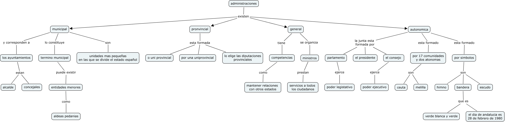 Este Cmap, tiene información relacionada con: yennifer_lopez_13_2ºB, municipal lo constituye termino municipal, autonomica esta formado por simbolos, autonomica esta formado por 17 comunidades y dos atonomas, pronvincial esta formada lo elige las diputaciones provinciales, por simbolos son himno, por simbolos son escudo, autonomica la junta esta formada por el consejo, municipal y corresponden a los ayuntamientos, los ayuntamientos estan concejales, municipal son unidades mas pequeñas en las que se divide el estado español, administraciones existen municipal, por 17 comunidades y dos atonomas son melilla, termino municipal puede existir entidades menores, por 17 comunidades y dos atonomas son ceuta, el consejo ejerce poder ejecutivo, pronvincial esta formada o uni provincial, bandera que es el dia de andalucia es 28 de febrero de 1980, autonomica la junta esta formada por parlamento, bandera que es verde blanca y verde, pronvincial esta formada por una uniprovincial