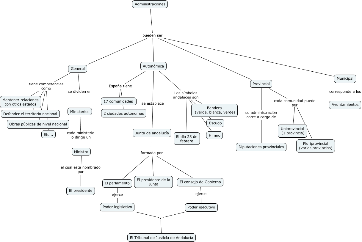 Este mapa conceptual tiene información relacionada a: 12- Jorge Jurado López, Autonómica se establece Junta de andalucía, General tiene competencias como Obras públicas de nivel nacional, Ministro el cual esta nombrado por El presidente, Ministerios cada ministerio lo dirige un Ministro, Administraciones pueden ser Provincial, Autonómica España tiene 17 comunidades, General tiene competencias como Mantener relaciones con otros estados, Administraciones pueden ser General, General tiene competencias como Etc..., General se dividen en Ministerios