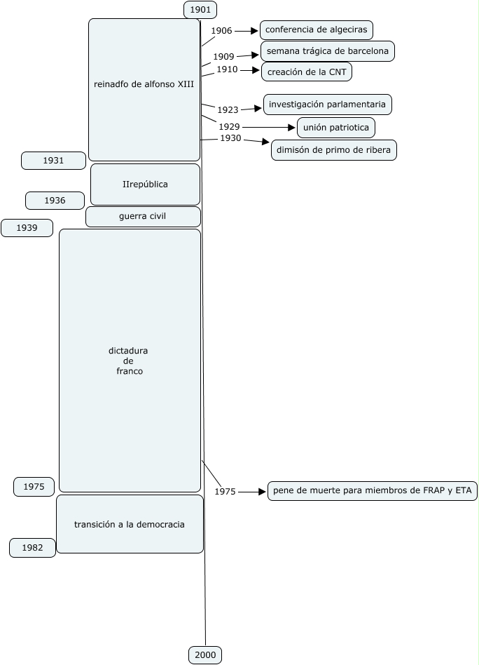 Este mapa conceptual tiene información relacionada a: 05.Juan José Barroso Ponce.España xiglo XX, dictadura de franco 1975 pene de muerte para miembros de FRAP y ETA, reinadfo de alfonso XIII 1929 unión patriotica, dictadura de primo de ribera 1930 dimisón de primo de ribera, reinadfo de alfonso XIII 1909 semana trágica de barcelona, reinadfo de alfonso XIII 1910 creación de la CNT, reinadfo de alfonso XIII 1906 conferencia de algeciras, 1901 2000, reinadfo de alfonso XIII 1923 investigación parlamentaria