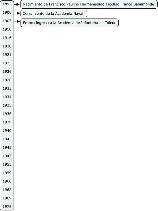 Este mapa conceptual tiene información relacionada a: 05.Isabel Chozas Rendón. Franco, 1892 1906 1907 1910 1916 1920 1921 1923 1926 1928 1933 1934 1935 1936 1939 1940 1943 1945 1947 1955 1959 1966 1968 1969 1975 ???? Cerramiento de la Academia Naval, 1892 1906 1907 1910 1916 1920 1921 1923 1926 1928 1933 1934 1935 1936 1939 1940 1943 1945 1947 1955 1959 1966 1968 1969 1975 ???? Nacimiento de Francisco Paulino Hermenegildo Teódulo Franco Bahamonde, 1892 1906 1907 1910 1916 1920 1921 1923 1926 1928 1933 1934 1935 1936 1939 1940 1943 1945 1947 1955 1959 1966 1968 1969 1975 ???? Franco ingresó a la Academia de Infantería de Toledo
