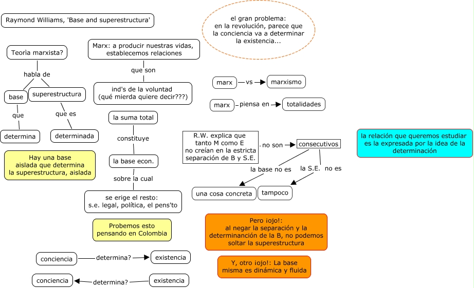 Este mapa conceptual tiene información relacionada a: Williams Base and Superstructure, marx piensa en totalidades, la suma total constituye la base econ., base que determina, R.W. explica que tanto M como E no creían en la estricta separación de B y S.E. no son consecutivos, la base econ. sobre la cual se erige el resto: s.e. legal, política, el pens'to, existencia determina? conciencia, Teorìa marxista? habla de superestructura, Teorìa marxista? habla de base, marx vs marxismo, consecutivos la S.E. no es tampoco, superestructura que es determinada, Marx: a producir nuestras vidas, establecemos relaciones que son ind's de la voluntad (qué mierda quiere decir???), consecutivos la base no es una cosa concreta, conciencia determina? existencia