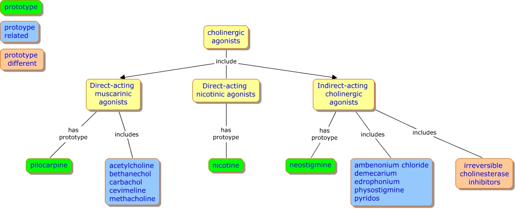 This Concept Map, created with IHMC CmapTools, has information related to: cholinoceptors, cholinergic agonists include Direct-acting nicotinic agonists, Direct-acting muscarinic agonists has prototype pilocarpine, Indirect-acting cholinergic agonists includes irreversible cholinesterase inhibitors, cholinergic agonists include Direct-acting muscarinic agonists, Direct-acting nicotinic agonists has protoype nicotine, Indirect-acting cholinergic agonists includes ambenonium chloride demecarium edrophonium physostigmine pyridos, cholinergic agonists include Indirect-acting cholinergic agonists, Indirect-acting cholinergic agonists has protoype neostigmine, Direct-acting muscarinic agonists includes acetylcholine bethanechol carbachol cevimeline methacholine