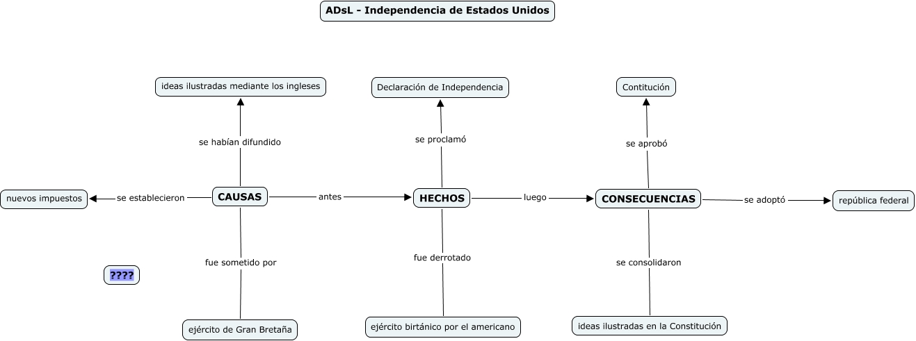 Este mapa conceptual tiene información relacionada a: 17.Carlos Rodríguez Daza-ADsL-Independencia de Estados Unidos, HECHOS se proclamó Declaración de Independencia, CAUSAS fue sometido por ejército de Gran Bretaña, CAUSAS se habían difundido ideas ilustradas mediante los ingleses, CONSECUENCIAS se adoptó república federal, CAUSAS antes HECHOS, CONSECUENCIAS se consolidaron ideas ilustradas en la Constitución, HECHOS luego CONSECUENCIAS, CONSECUENCIAS se aprobó Contitución, HECHOS fue derrotado ejército birtánico por el americano, CAUSAS se establecieron nuevos impuestos