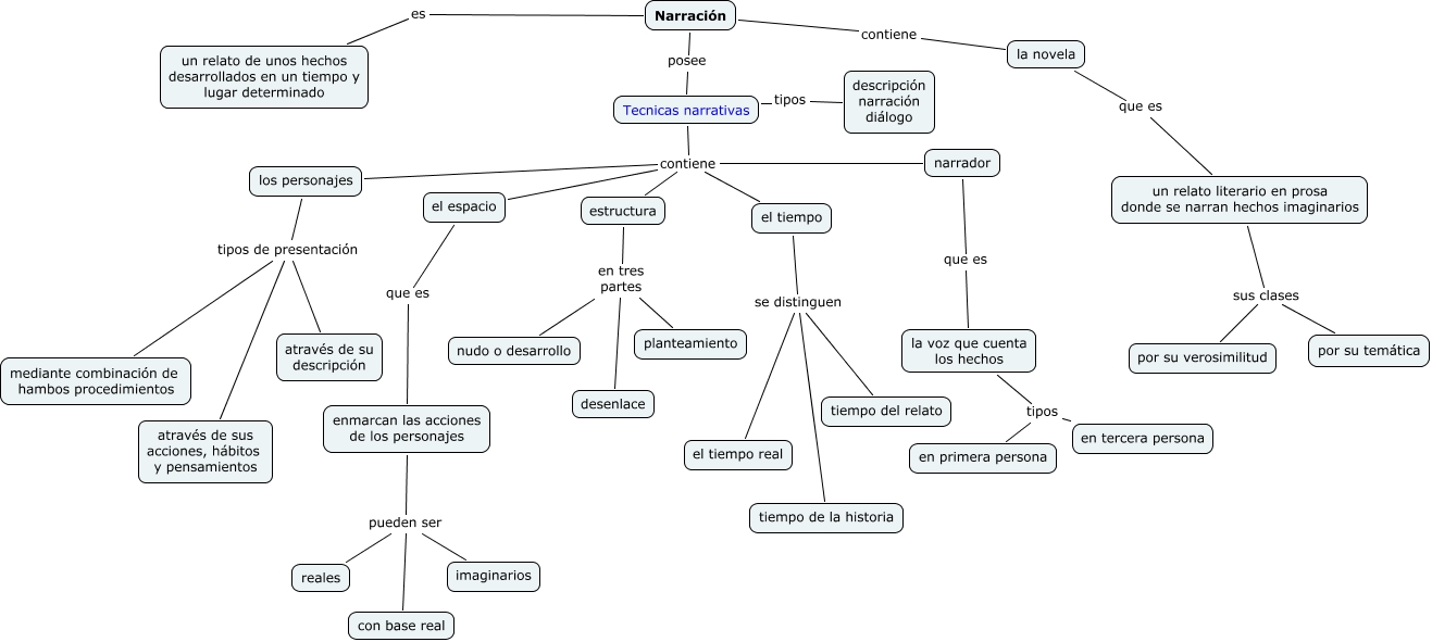 Este mapa conceptual tiene información relacionada a: Ana González Martín tema5, Narración es un relato de unos hechos desarrollados en un tiempo y lugar determinado, Narración posee Tecnicas narrativas, Tecnicas narrativas contiene los personajes, los personajes tipos de presentación através de su descripción, un relato literario en prosa donde se narran hechos imaginarios sus clases por su temática, Tecnicas narrativas contiene estructura, estructura en tres partes planteamiento, la novela que es un relato literario en prosa donde se narran hechos imaginarios, estructura en tres partes nudo o desarrollo, estructura en tres partes desenlace