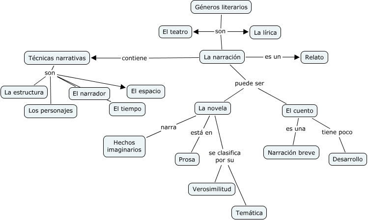 Este mapa conceptual tiene información relacionada a: Jorge 2º B Unidad 5 Lengua, La novela está en Prosa, La novela narra Hechos imaginarios, El cuento tiene poco Desarrollo, Técnicas narrativas son El espacio, Géneros literarios son La narración, Géneros literarios son El teatro, La narración contiene Técnicas narrativas, La narración es un Relato, El cuento es una Narración breve, La novela se clasifica por su Verosimilitud