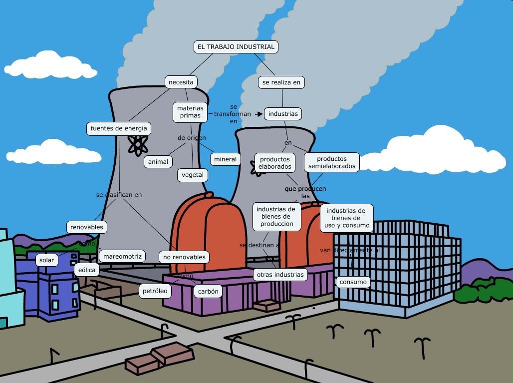 Este mapa conceptual tiene información relacionada a: francisco leon zacarias tema 5, EL TRABAJO INDUSTRIAL ???? necesita, renovables como mareomotriz, materias primas de origen animal, materias primas de origen mineral, industrias en productos elaborados, fuentes de energia se clasifican en no renovables, necesita ???? fuentes de energia, necesita ???? materias primas, industrias de bienes de produccion se destinan a otras industrias, no renovables como petróleo