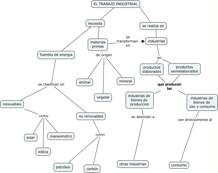 Este mapa conceptual tiene información relacionada a: Jose Carlos Tema 5, EL TRABAJO INDUSTRIAL ???? necesita, renovables como mareomotriz, materias primas de origen animal, materias primas de origen mineral, fuentes de energia se clasifican en no renovables, industrias en productos elaborados, necesita ???? fuentes de energia, necesita ???? materias primas, no renovables como petróleo, industrias de bienes de produccion se destinan a otras industrias