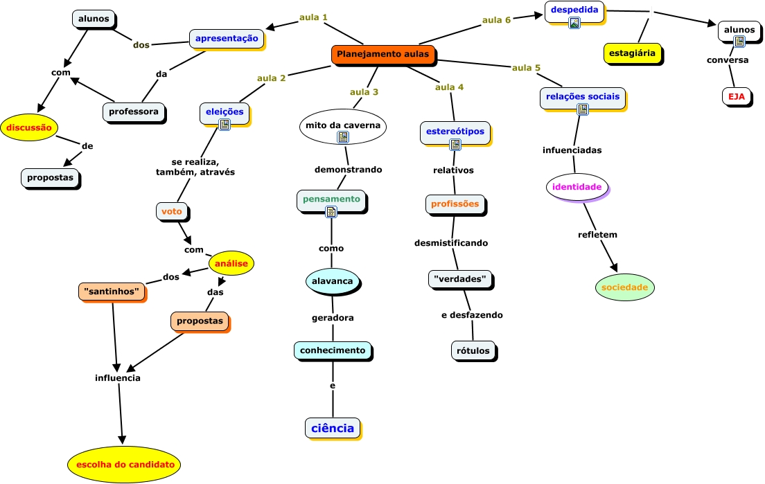 Este Mapa Conceitual tem informações relacionadas a: Plano de aula, conhecimento e ciência, análise das propostas, alunos com discussão, profissões desmistificando "verdades", despedida estagiária, voto com análise, Planejamento aulas aula 1 apresentação, alunos conversa EJA, relações sociais infuenciadas identidade, despedida alunos, Planejamento aulas aula 4 estereótipos, Planejamento aulas aula 5 relações sociais, Planejamento aulas aula 2 eleições, professora com discussão, discussão de propostas, pensamento como alavanca, propostas influencia escolha do candidato, "verdades" e desfazendo rótulos, eleições se realiza, também, através voto, identidade refletem sociedade