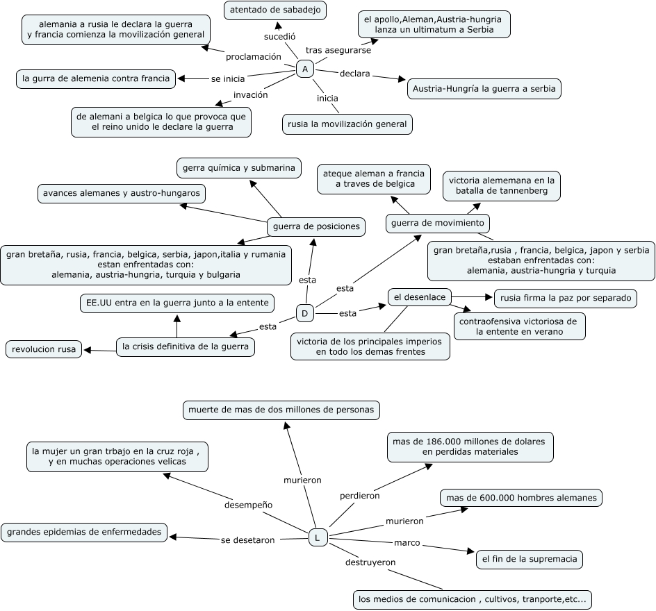 Este mapa conceptual tiene información relacionada a: 05.Juan José Barroso Ponce.1ªguerra mundfial, guerra de movimiento se produjo victoria alememana en la batalla de tannenberg, A proclamación alemania a rusia le declara la guerra y francia comienza la movilización general, guerra de posiciones ???? gerra química y submarina, L marco el fin de la supremacia, el desenlace ???? victoria de los principales imperios en todo los demas frentes, la crisis definitiva de la guerra ???? EE.UU entra en la guerra junto a la entente, D esta guerra de movimiento, L desempeño la mujer un gran trbajo en la cruz roja , y en muchas operaciones velicas, L destruyeron los medios de comunicacion , cultivos, tranporte,etc..., el desenlace ???? rusia firma la paz por separado