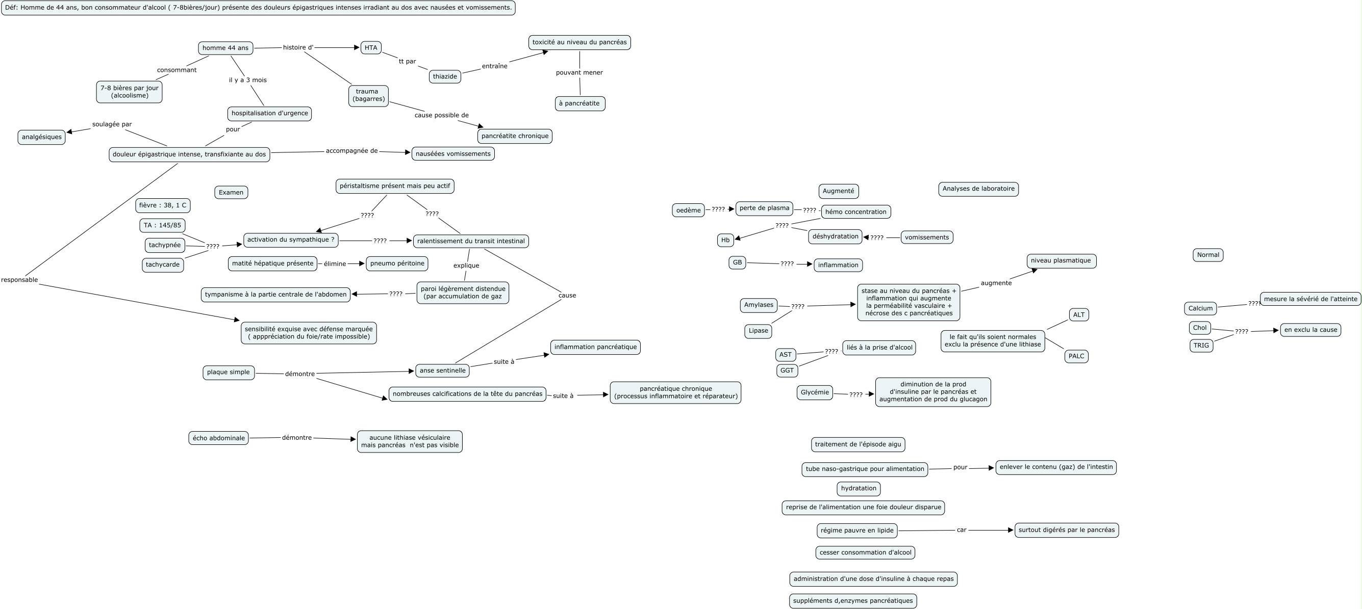 This Concept Map, created with IHMC CmapTools, has information related to: app5 aller, GGT ???? liés à la prise d'alcool, toxicité au niveau du pancréas pouvant mener à pancréatite, trauma (bagarres) cause possible de pancréatite chronique, Calcium ???? mesure la sévérié de l'atteinte, hospitalisation d'urgence pour douleur épigastrique intense, transfixiante au dos, vomissements ???? déshydratation, homme 44 ans il y a 3 mois hospitalisation d'urgence, thiazide entraîne toxicité au niveau du pancréas, tachypnée ???? activation du sympathique ?, TRIG ???? en exclu la cause, douleur épigastrique intense, transfixiante au dos responsable sensibilité exquise avec défense marquée ( apppréciation du foie/rate impossible), TA : 145/85 ???? activation du sympathique ?, homme 44 ans histoire d' HTA, Chol ???? en exclu la cause, nombreuses calcifications de la tête du pancréas suite à pancréatique chronique (processus inflammatoire et réparateur), homme 44 ans consommant 7-8 bières par jour (alcoolisme), écho abdominale démontre aucune lithiase vésiculaire mais pancréas n'est pas visible, douleur épigastrique intense, transfixiante au dos accompagnée de nauséées vomissements, perte de plasma ???? hémo concentration, Glycémie ???? diminution de la prod d'insuline par le pancréas et augmentation de prod du glucagon