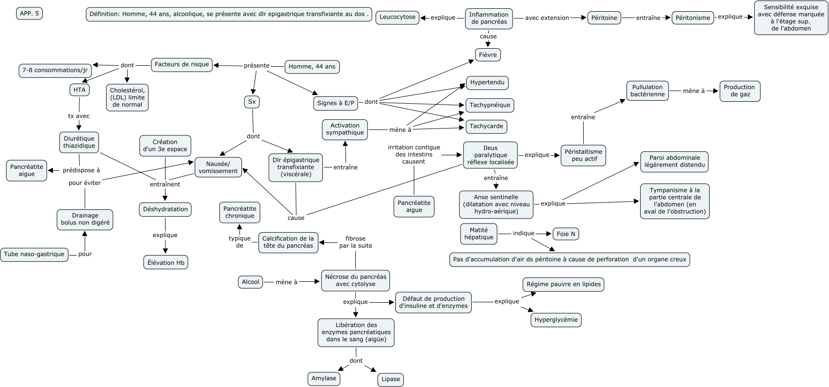 This Concept Map, created with IHMC CmapTools, has information related to: App. 5 - aller, Activation sympathique mène à Tachycarde, HTA tx avec Diurétique thiazidique, Homme, 44 ans présente Facteurs de risque, Activation sympathique mène à Tachypnéique, Ileus paralytique réflexe localisée entraîne Anse sentinelle (dilatation avec niveau hydro-aérique), Sx dont Nausée/ vomissement, Calcification de la tête du pancréas typique de Pancréatite chronique, Libération des enzymes pancréatiques dans le sang (aigüe) dont Lipase, Ileus paralytique réflexe localisée explique Péristaltisme peu actif, Diurétique thiazidique entraînent Déshydratation, Facteurs de risque dont HTA, Inflammation de pancréas avec extension Péritoine, Dlr épigastrique transfixiante (viscérale) entraîne Activation sympathique, Péristaltisme peu actif entraîne Pullulation bactérienne, Homme, 44 ans présente Signes à E/P, Signes à E/P dont Tachypnéique, Péritonisme explique Sensibilité exquise avec défense marquée à l'étage sup. de l'abdomen, Nausée/ vomissement entraînent Déshydratation, Dlr épigastrique transfixiante (viscérale) cause Nausée/ vomissement, Nécrose du pancréas avec cytolyse explique Défaut de production d'insuline et d'enzymes