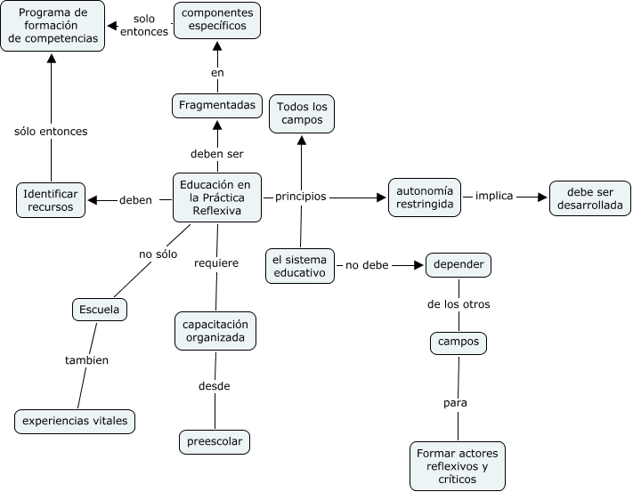 Este mapa conceptual tiene información relacionada a: Formación en la practica reflexiva, capacitación organizada desde preescolar, Educación en la Práctica Reflexiva principios Todos los campos, Educación en la Práctica Reflexiva principios autonomía restringida, Identificar recursos sólo entonces Programa de formación de competencias, el sistema educativo no debe depender, Educación en la Práctica Reflexiva no sólo Escuela, campos para Formar actores reflexivos y críticos, Escuela tambien experiencias vitales, autonomía restringida implica debe ser desarrollada, Educación en la Práctica Reflexiva deben ser Fragmentadas, Educación en la Práctica Reflexiva principios el sistema educativo, Educación en la Práctica Reflexiva requiere capacitación organizada, Fragmentadas en componentes específicos, componentes específicos solo entonces Programa de formación de competencias, depender de los otros campos, Educación en la Práctica Reflexiva deben Identificar recursos