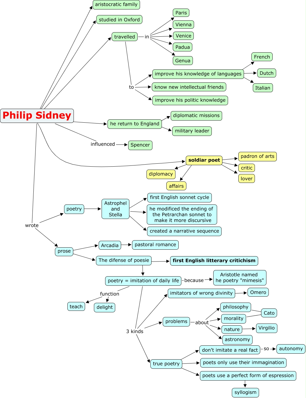 Questa Mappa Concettuale ha informazioni correlate a: Philip Sidney, improve his knowledge of languages ???? Dutch, problems about morality, Philip Sidney ???? soldiar poet, travelled in Venice, Philip Sidney wrote prose, Philip Sidney ???? studied in Oxford, poets use a perfect form of espression ???? syllogism, travelled in Padua, problems about nature, soldiar poet ???? affairs