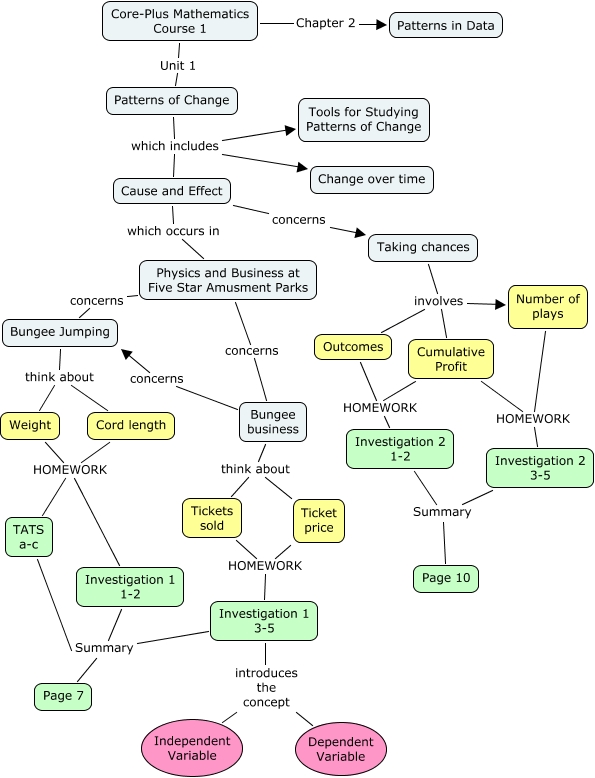 This Concept Map, created with IHMC CmapTools, has information related to: Math Text, Investigation 1 3-5 introduces the concept Independent Variable, Taking chances involves Outcomes, Bungee Jumping think about Cord length, TATS a-c Summary Page 7, Cause and Effect which occurs in Physics and Business at Five Star Amusment Parks, Patterns of Change which includes Change over time, Investigation 1 3-5 introduces the concept Dependent Variable, Bungee business concerns Bungee Jumping, Bungee business think about Ticket price, Cumulative Profit HOMEWORK Investigation 2 1-2, Number of plays HOMEWORK Investigation 2 3-5, Bungee business think about Tickets sold, Taking chances involves Cumulative Profit, Core-Plus Mathematics Course 1 Chapter 2 Patterns in Data, Investigation 1 1-2 Summary Page 7, Bungee Jumping think about Weight, Patterns of Change which includes Cause and Effect, Patterns of Change which includes Tools for Studying Patterns of Change, Core-Plus Mathematics Course 1 Unit 1 Patterns of Change, Weight HOMEWORK TATS a-c
