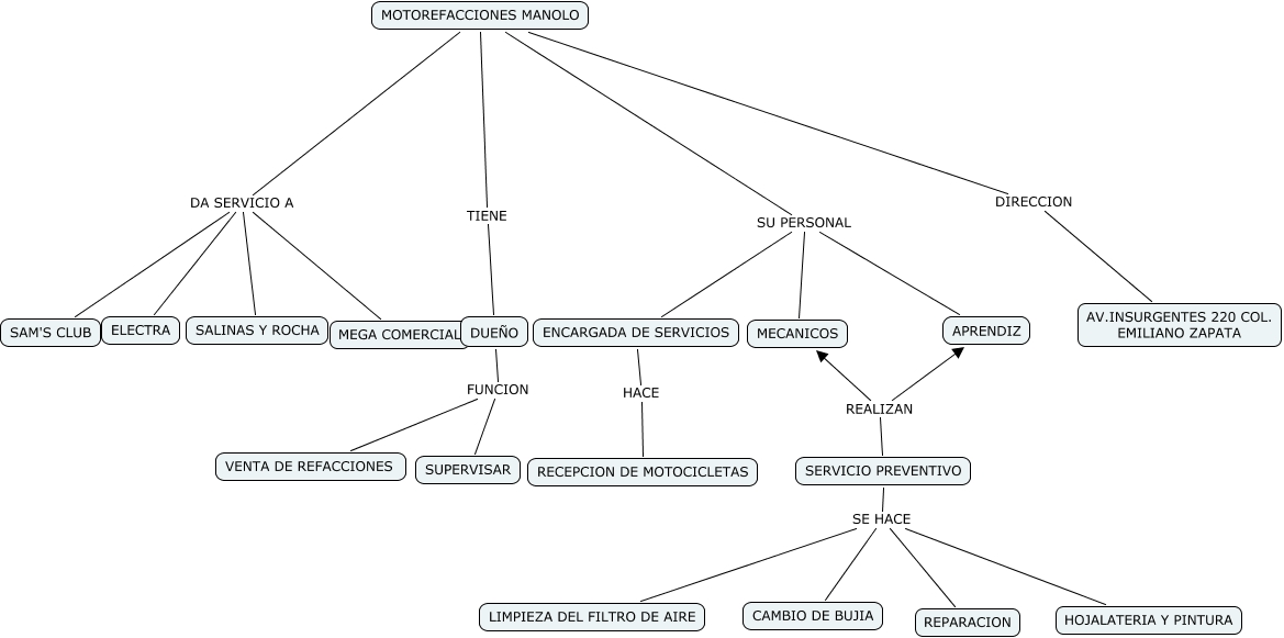 Este mapa conceptual tiene información relacionada a: REFACCIONARIA MANOLL, MOTOREFACCIONES MANOLO DIRECCION AV.INSURGENTES 220 COL. EMILIANO ZAPATA, SERVICIO PREVENTIVO SE HACE HOJALATERIA Y PINTURA, MOTOREFACCIONES MANOLO DA SERVICIO A MEGA COMERCIAL, MOTOREFACCIONES MANOLO DA SERVICIO A ELECTRA, MOTOREFACCIONES MANOLO DA SERVICIO A SALINAS Y ROCHA, LIMPIEZA DEL FILTRO DE AIRE SE HACE CAMBIO DE BUJIA, LIMPIEZA DEL FILTRO DE AIRE SE HACE HOJALATERIA Y PINTURA, MOTOREFACCIONES MANOLO TIENE DUEÑO, SERVICIO PREVENTIVO REALIZAN MECANICOS, DUEÑO FUNCION SUPERVISAR