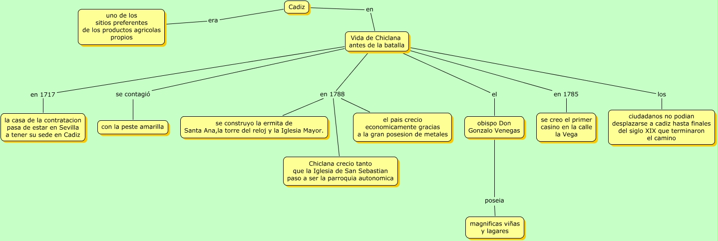 Este mapa conceptual tiene información relacionada a: 23.Juan Antonio Rguez-Tenorio.Chiclana antes de la batalla, Vida de Chiclana antes de la batalla en 1788 se construyo la ermita de Santa Ana,la torre del reloj y la Iglesia Mayor., Vida de Chiclana antes de la batalla el obispo Don Gonzalo Venegas, Vida de Chiclana antes de la batalla se contagió con la peste amarilla, Vida de Chiclana antes de la batalla en 1717 la casa de la contratacion pasa de estar en Sevilla a tener su sede en Cadiz, Vida de Chiclana antes de la batalla en 1788 Chiclana crecio tanto que la Iglesia de San Sebastian paso a ser la parroquia autonomica, obispo Don Gonzalo Venegas poseia magnificas viñas y lagares, Cadiz en Vida de Chiclana antes de la batalla, Vida de Chiclana antes de la batalla los ciudadanos no podian desplazarse a cadiz hasta finales del siglo XIX que terminaron el camino, Vida de Chiclana antes de la batalla en 1785 se creo el primer casino en la calle la Vega, Cadiz era uno de los sitios preferentes de los productos agricolas propios, Vida de Chiclana antes de la batalla en 1788 el pais crecio economicamente gracias a la gran posesion de metales