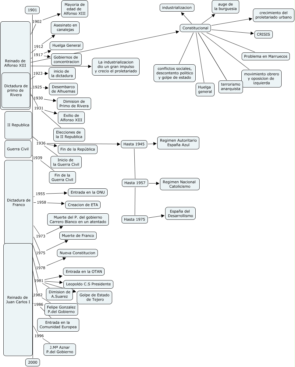 Este mapa conceptual tiene información relacionada a: 22.Juan Ulloa Gil.España Siglo XX, Reinado de Alfonso XIII 1917 Huelga General, Constitucional Problema en Marruecos, Dictadura de Franco 1955 Entrada en la ONU, Constitucional CRISIS, Constitucional movimiento obrero y oposicion de izquierda, Guerra Civil 1939 Fin de la Guerra Civil, Reinado de Alfonso XIII 1912 Asesinato en canalejas, Constitucional crecimiento del proletariado urbano, Constitucional terrorismo anarquista, 1901 2000